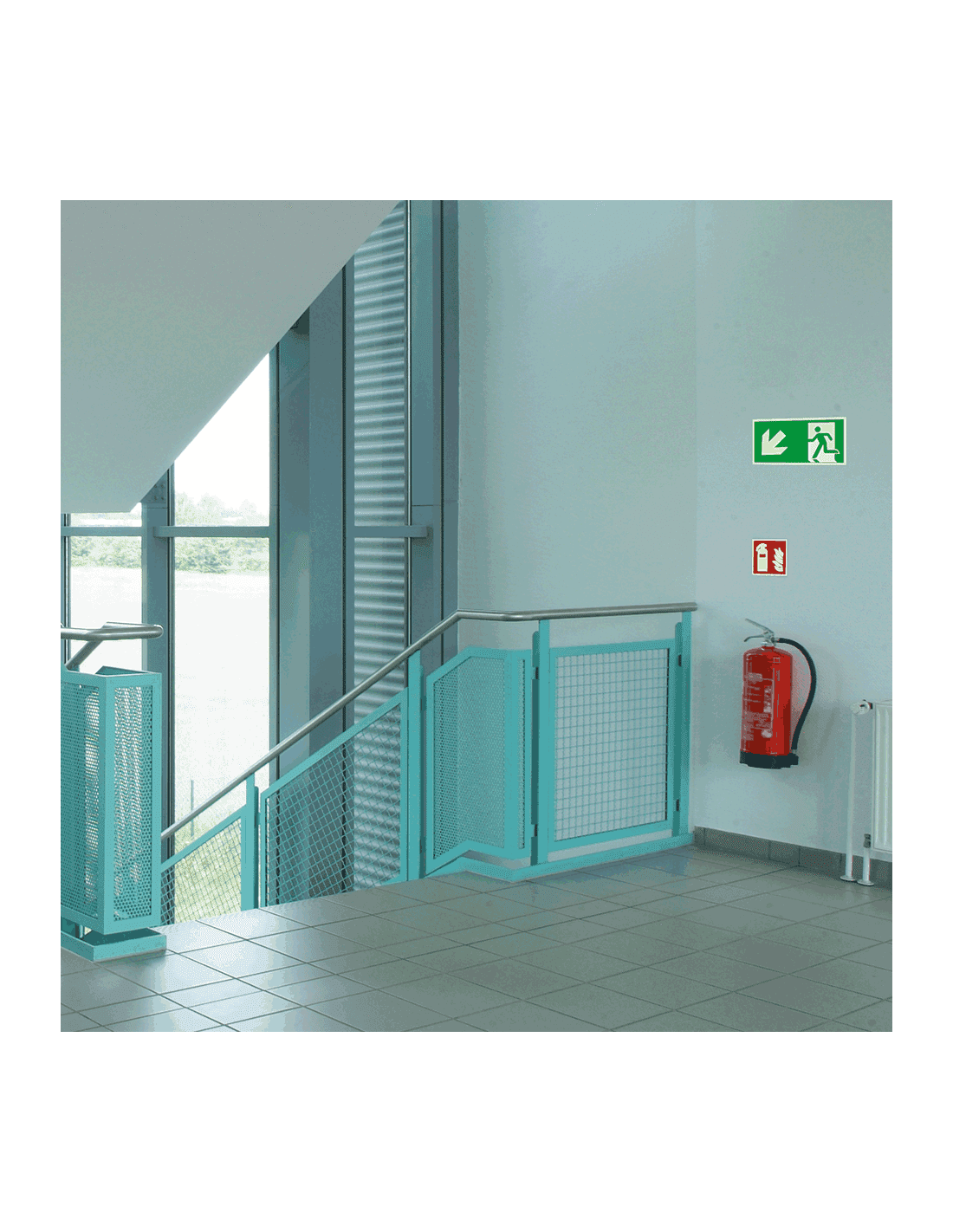 - Dit materiaal is geschikt voor ruimtes met gedempte of slechts tijdelijke verlichting; voor degenen die onder de BGR 216 vallen: hotels, ziekenhuizen, luchthavens, evenementenlocaties, fabrieken en magazijnen enz.