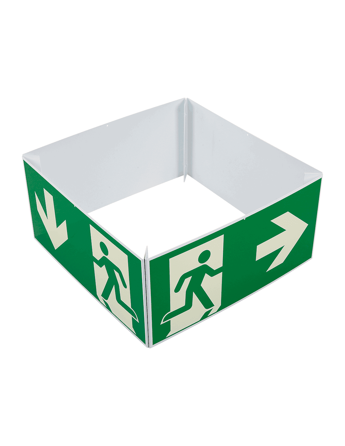 Lichtgevende nooduitgang kubus beneden, rechts, links bestaat uit 4 onderdelen: 1 nooduitgang bord met pijl naar beneden, 1 naar links, 1 naar rechts en 1 blanco bord. Je kunt de kubus zowel binnen als buiten gebruiken. De borden zijn temperatuurbestendig van -40 tot + 70 ° C, bestand tegen vocht en zwakke zuren en vlamvertragend. De gatdiameter om het bord mee op te hangen is 5 mm. Je krijgt de kubus inclusief bevestigingsmateriaal geleverd.