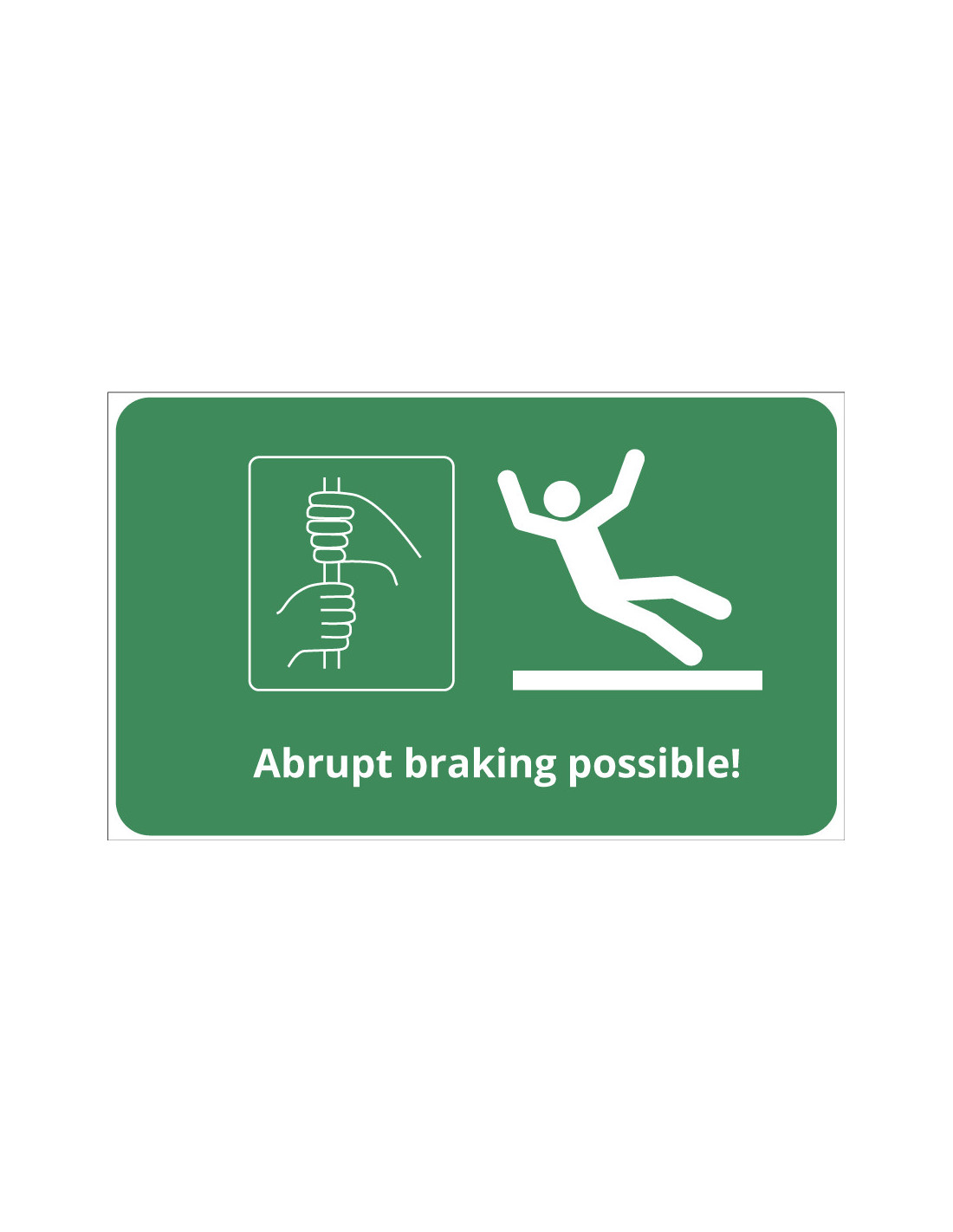 Deze borden Abrupt braking possible, kunststof, geeft aan dat het mogelijk is dat er in een bepaald voertuig plots wordt geremd. Omdat dit het geval kan zijn moet men zich goed vasthouden tijdens de rit. Het bord attendeert daar dus extra op.