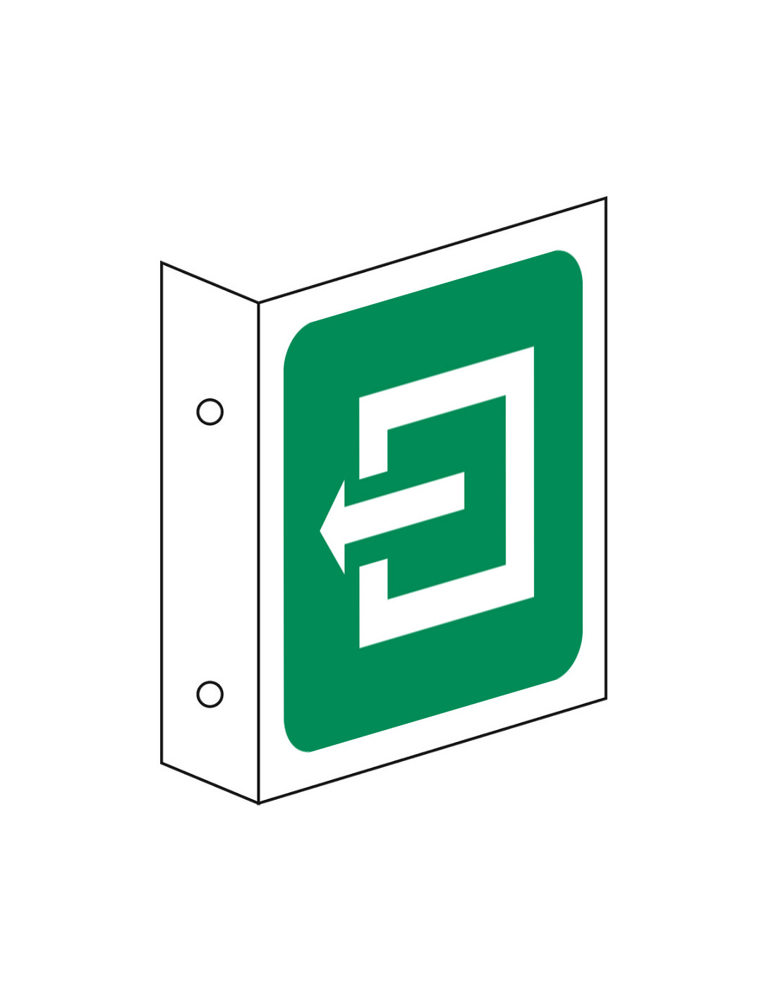 Dit bord heeft een haakse vorm die het beste tegen een wand kan worden bevestigd. Dit kan doormiddel van schroeven of een plakmechanisme. Aan beide zijden van het bordje zit een pictogram die aanwijst waar de vluchtweg is.