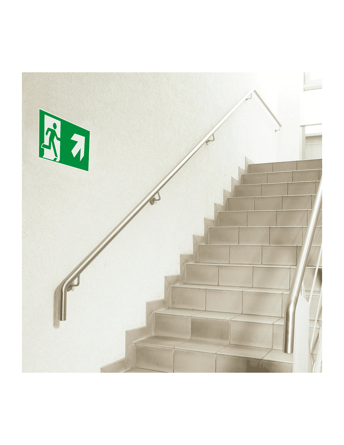Dit nooduitgang pijl rechtsboven bord laat zien dat dat nooduitgang kan worden gevonden wanneer men naar rechtsboven loopt. Op die manier zorgt u ervoor dat mensen in een noodsituatie precies weten waar de nooduitgang is.