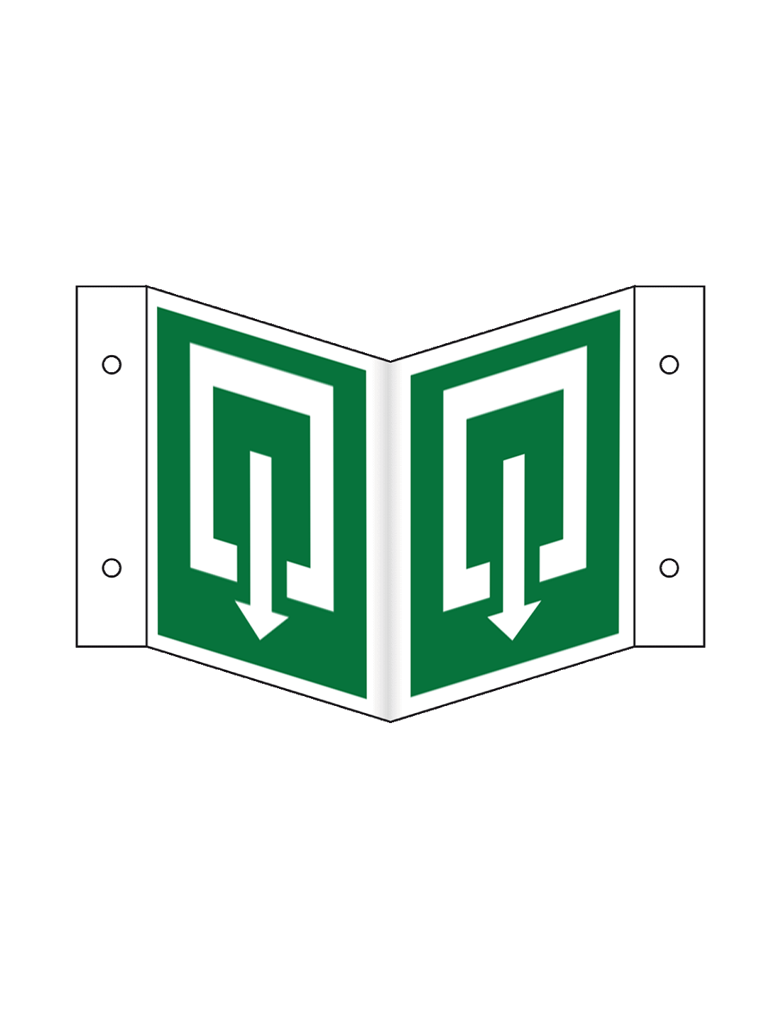 Dit bord heeft een panorama vorm die het beste tegen een wand kan worden bevestigd. Dit kan doormiddel van schroeven of een plakmechanisme. Aan beide zijden van het bordje zit een pictogram die aanwijst waar de vluchtweg is.