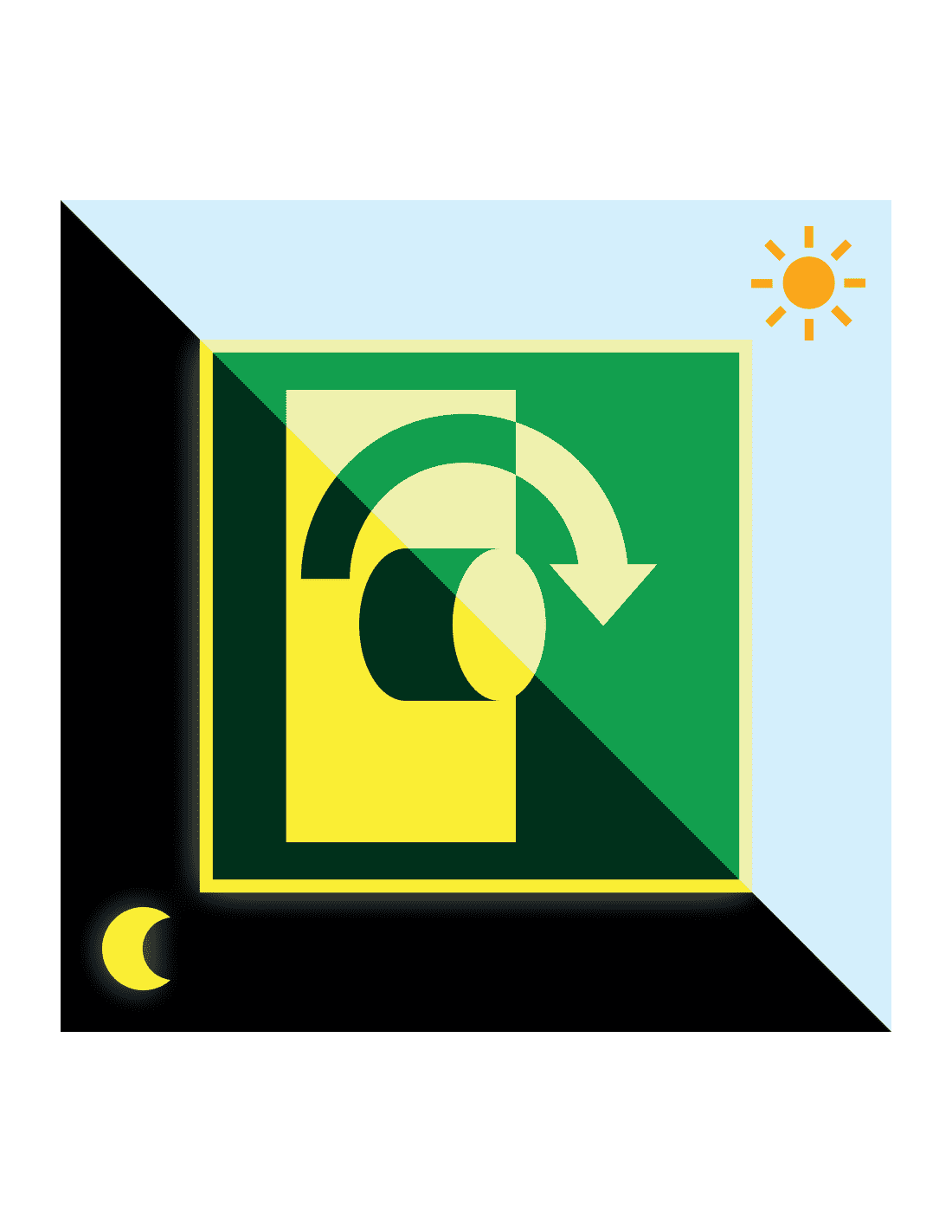 Dit “Lichtgevende nooduitgang bord pictogram Deur openen naar rechts draaien” is het officiële bord om een nooduitgang aan te duiden. Dit nooduitgang bord is conform volgens de ISO 7010 norm en van goede kwaliteit. Het bord is bestand tegen temperaturen tussen de -40 tot +130 °C en vocht + zwakke zuren. Het bord is te gebruiken voor binnen en beperkt buiten gebruik. Dit bord is gemaakt van Permalight. Dat houdt in dat het nooduitgang bord licht geeft wanneer de stroom is uitgevallen of donker is.