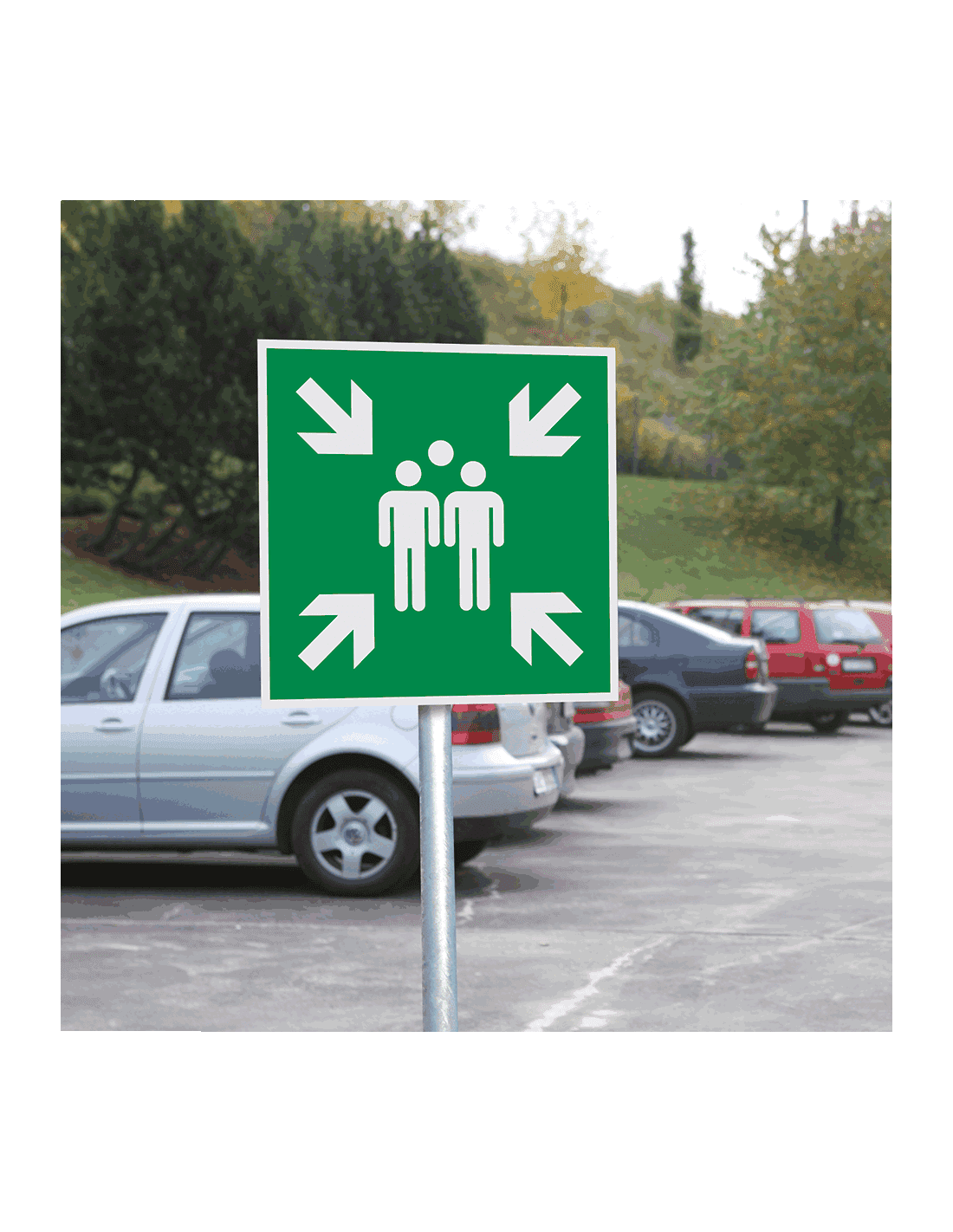 Verder is het symbool verzamelplaats gekeurd volgens de laatste veiligheidsnorm. Dit is de norm DIN EN ISO 7010 E007. Het bord is gemaakt van aluminium, wat hem geschikt maakt voor binnen- en buitengebruik. Bovendien is het bord temperatuurbestendig van -50 tot +130 °C en resistent tegen oplosmiddel en veel chemicaliën. Het bord is licht, stabiel, niet brandbaar en niet breekbaar. Het bord is ook beschikbaar in een voorgeboorde variant met vier boorgaten met een doorsnede van 7 mm.