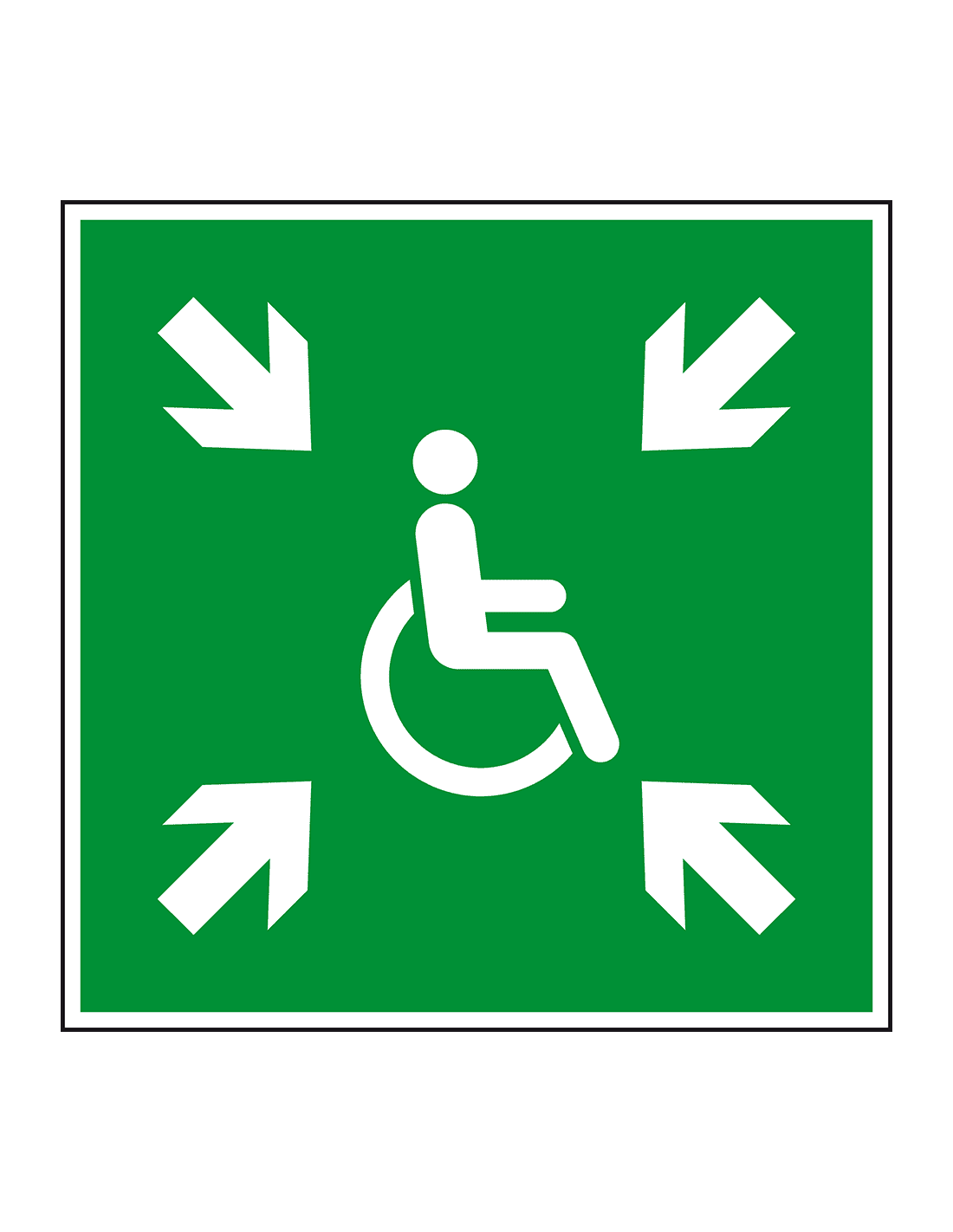 Verder is het symbool verzamelplaats invaliden gekeurd volgens de laatste veiligheidsnorm. Dit is de norm DIN EN ISO 7010 E024. Het bord is gemaakt van aluminium, wat hem geschikt maakt voor binnen- en buitengebruik. Bovendien is het bord temperatuurbestendig van -50 tot +130 °C en resistent tegen oplosmiddel en veel chemicaliën. Het bord is licht, stabiel, onbreekbaar en niet ontvlambaar.