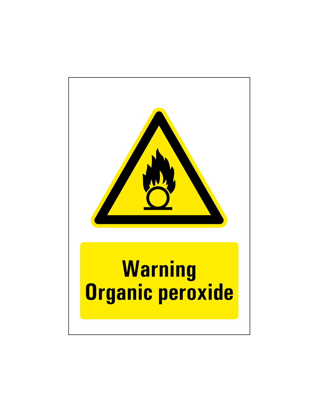 Het Warning organic peroxide bord is een rechthoekig bord met het symbool van oxiderende stoffen om aan te geven dat er hier sprake is van organische peroxide. Het bord is voorzien van de Engelse tekst "Warning organic peroxide" in zwarte letters op een gele achtergrond. Het bord is verkrijgbaar in verschillende afmetingen en is geschikt voor binnen- en buitengebruik.