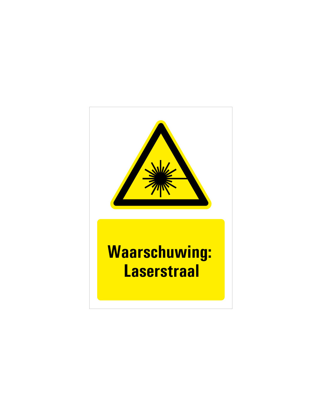 Dit staande rechthoekige laserstraal bord met tekst laat zien dat er sprake is van gevaar voor laserstraling. Deze straling kan bijvoorbeeld leiden tot brand, verblinding of ander letsel aan de ogen. Daarom is het van belang om hiervoor te waarschuwen. Leverbaar in de formaten: A5, A4 en A3