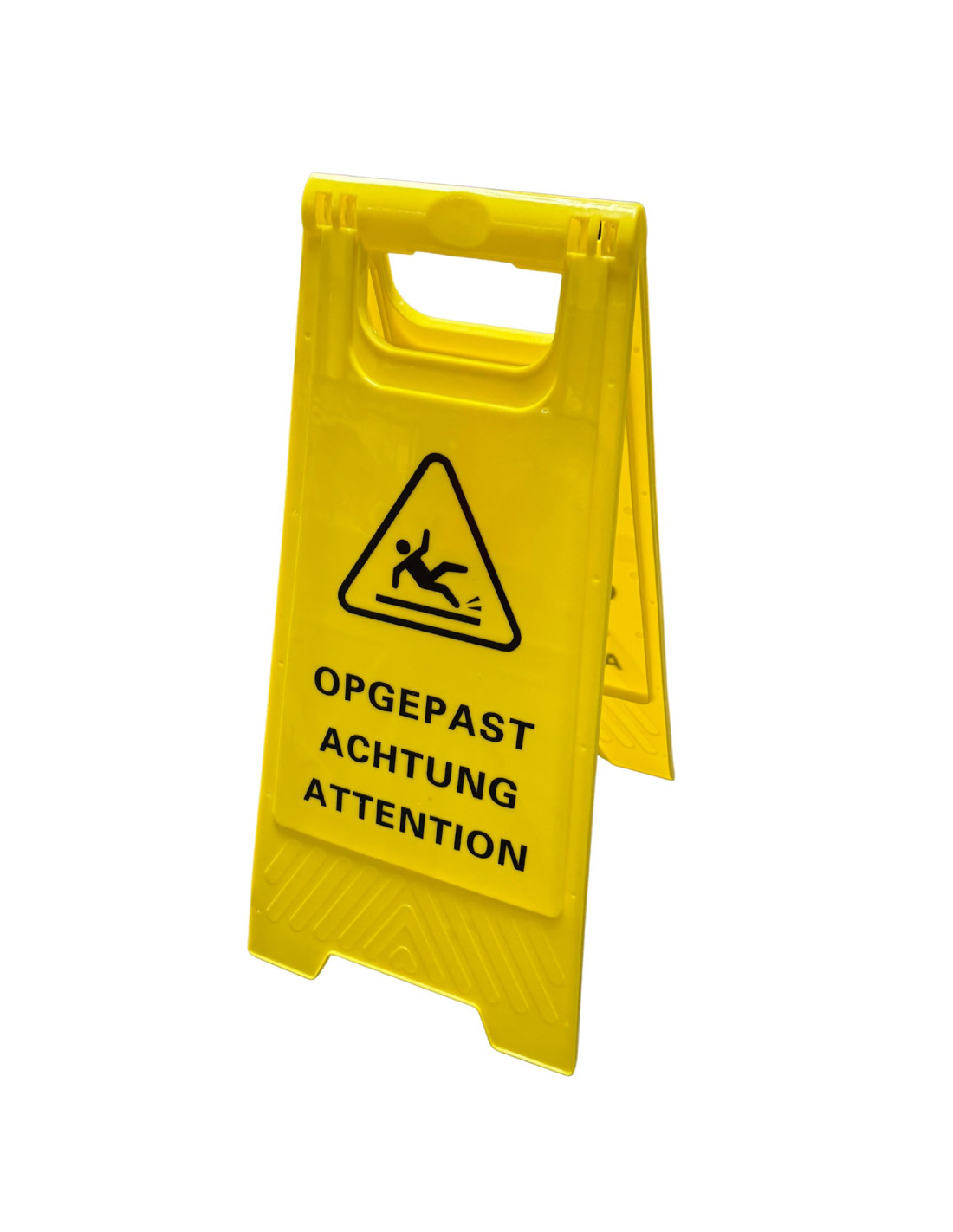 Het Ri-Traffic Klapbord waarschuwingsbord – Pas op glad is een onmisbaar hulpmiddel om bezoekers en medewerkers te waarschuwen voor slipgevaar. Dankzij de opvallende gele kleur en de duidelijke tekst in vier talen – Nederlands, Engels, Frans en Duits – is dit waarschuwingsbord internationaal inzetbaar in uiteenlopende omgevingen. Van winkelcentra en hotels tot kantoren en magazijnen: dit bord verhoogt direct de veiligheid waar een gladde vloer dreigt.