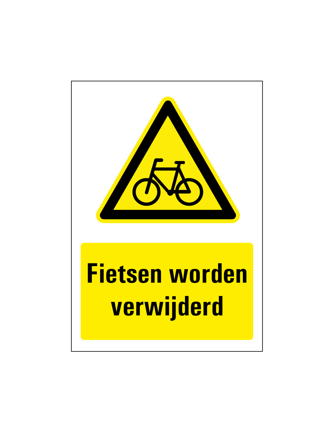 Het Fietsen worden verwijderd bord is een rechthoekig bord met een waarschuwingssymbool om aan te geven dat fietsen op deze plek worden verwijderd. Het bord is voorzien van de Nederlandse tekst "Fietsen worden verwijderd" in zwarte letters op een gele achtergrond. Het bord is verkrijgbaar in verschillende afmetingen en is geschikt voor binnen- en buitengebruik.