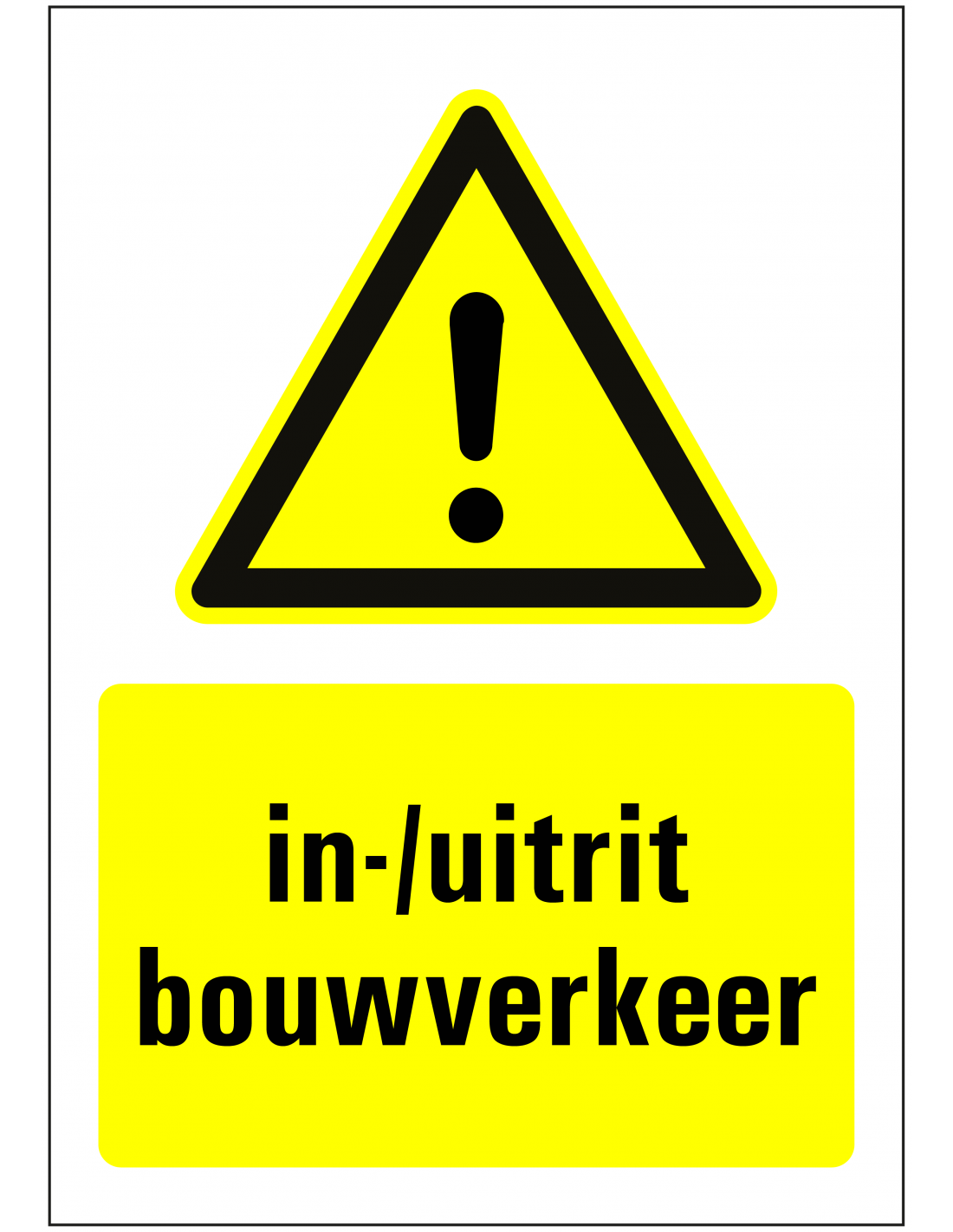 Het pas op in-/uitrit bouwverkeer bord met tekst kun je gebruiken om te waarschuwen voor een in- en uitrit voor bouwverkeer op deze plek. Op die manier maak je op een gemakkelijke manier duidelijk dat er sprake is van een in en uitrit voor bouwverkeer en kunnen mensen hier rekening mee houden.