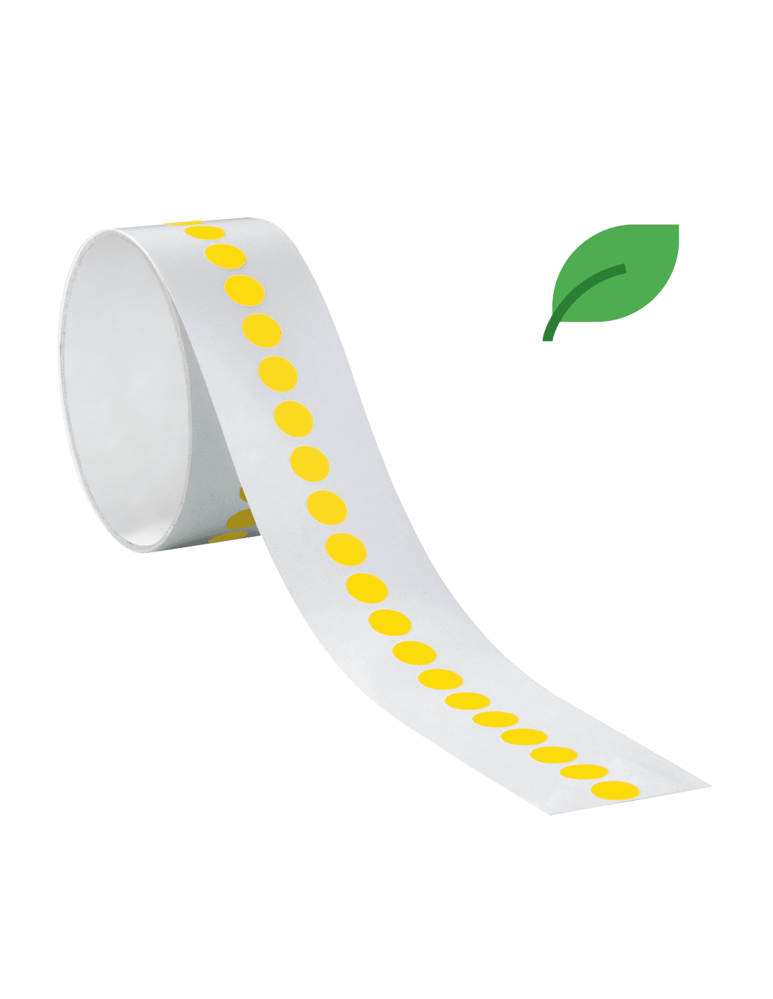Deze duurzame gele markeringspunten stickers zijn gemaakt van ecologische folie. Dit betekent dat het basismateriaal van de stickers composteerbaar zijn. Hierdoor zijn de stickers met name geschikt voor binnengebruik. De markeringspunten stickers hebben verder een gele kleur en een afmeting van 25 millimeter.