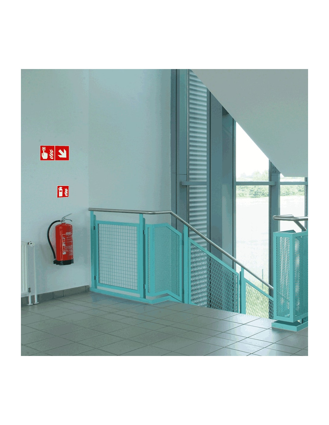 Deze sticker laat door middel van de schuine brand pijl zien welke richting iemand op moet om bijvoorbeeld een brandblusser te vinden. Zo kunnen mensen in geval van een noodsituatie gemakkelijk zien waar een blusmiddel te vinden is. Dit kan mensenlevens redden.