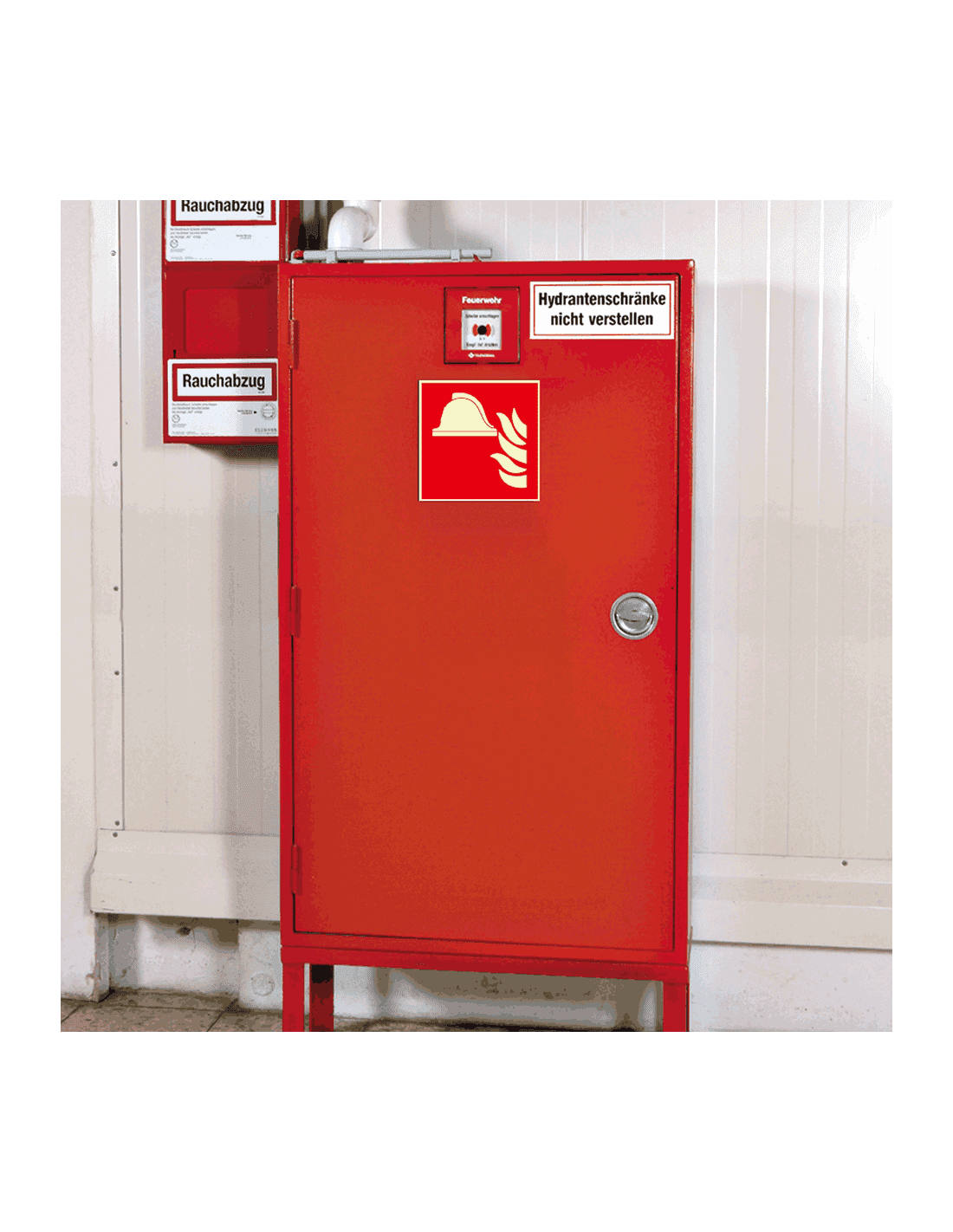 Deze extra lichtgevende sticker laat door middel van het brandweerhelm en vuur teken zien waar de materiaalopslag zich bevindt. Zo kunnen mensen in geval van een noodsituatie gemakkelijk zien waar het materiaal te vinden is. Dit kan mensenlevens redden.
