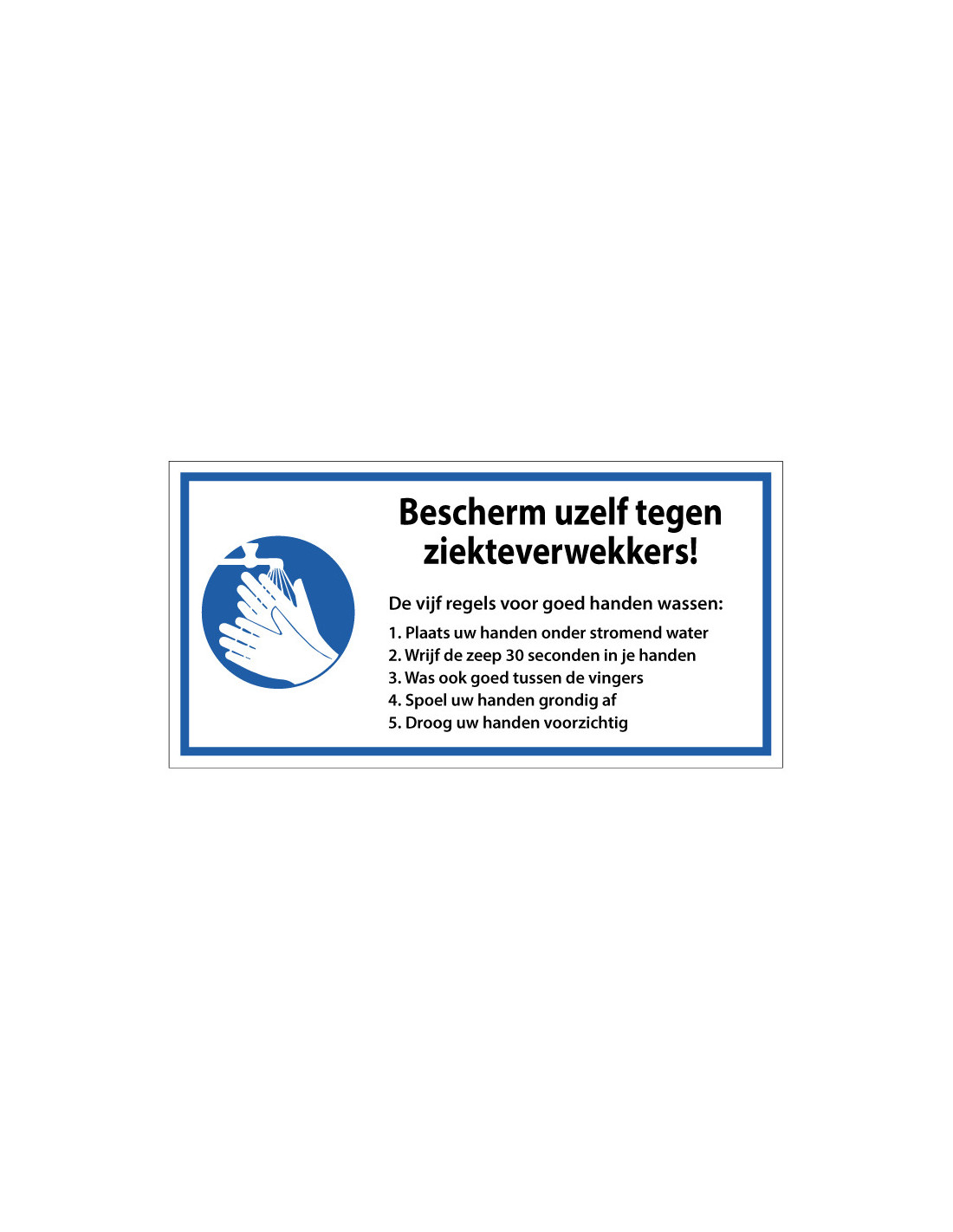 Deze sticker laat door middel van het symbool met tekst zien dat er sprake is van een handleiding om handen te wassen. Dit kunt u bijvoorbeeld gebruiken wanneer u wilt dat ziekteverwekkers zich verspreiden.