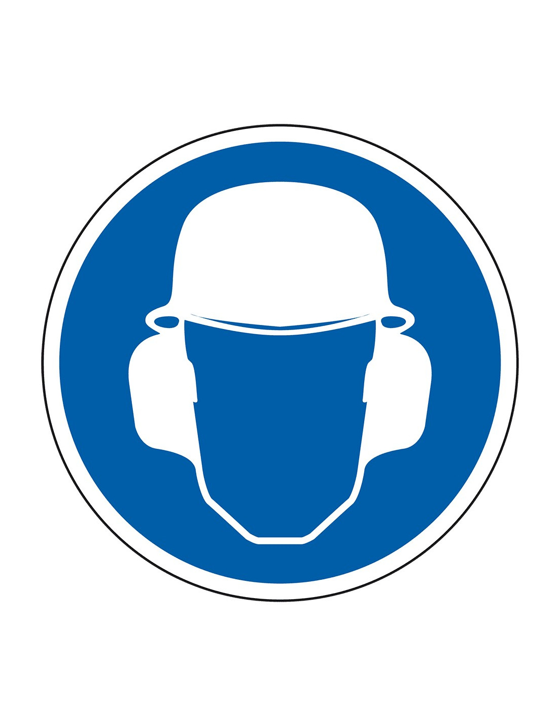 - Ronde sticker met pictogram helm en oorkap verplicht