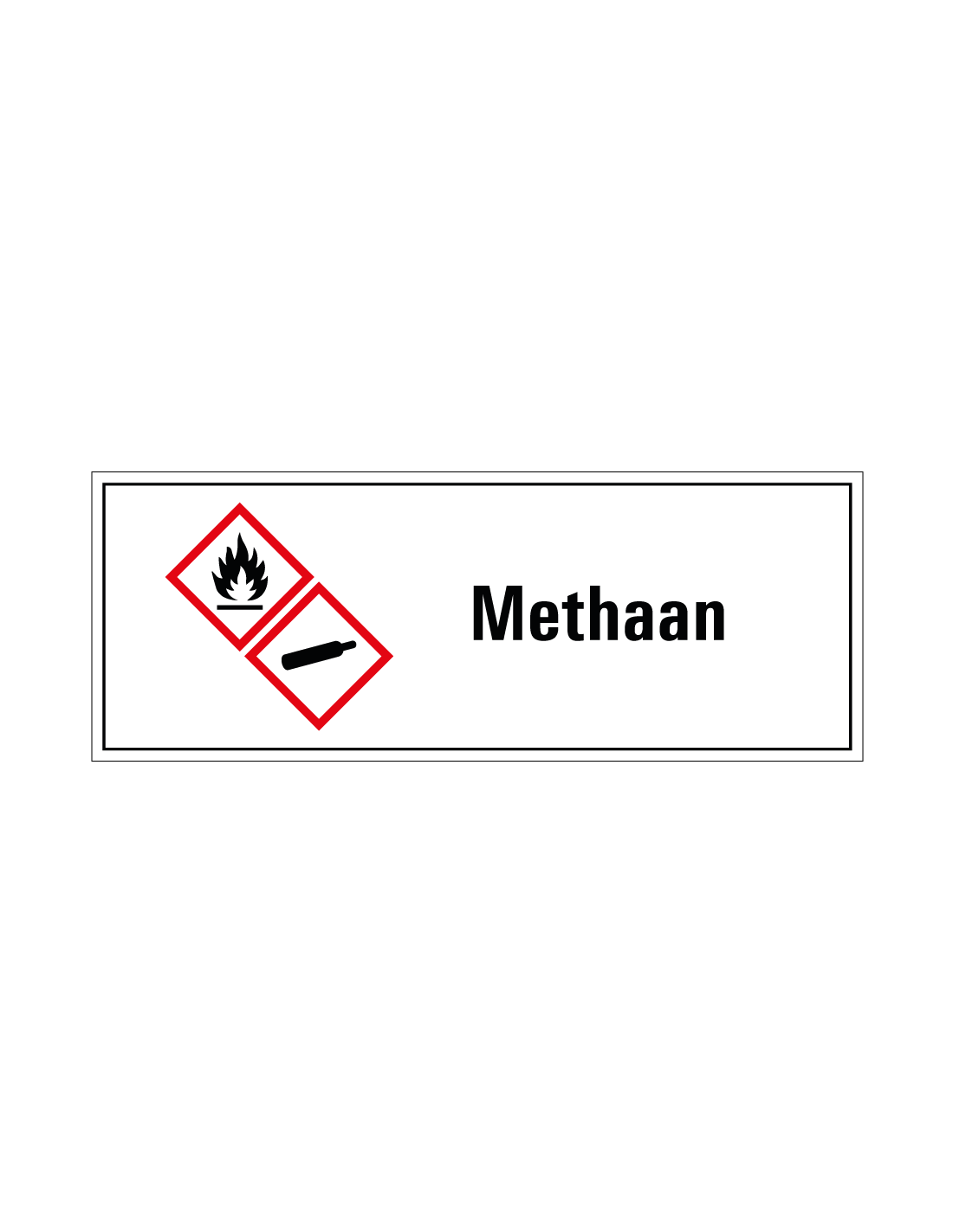 De methaan GHS tekststicker met GHS02 en GHS04 pictogrammen geeft aan dat met een chemische stof voorzichtig omgegaan moet worden. Er zitten namelijk gevaarlijke chemicaliën in de stof die de gezondheid kunnen schaden.