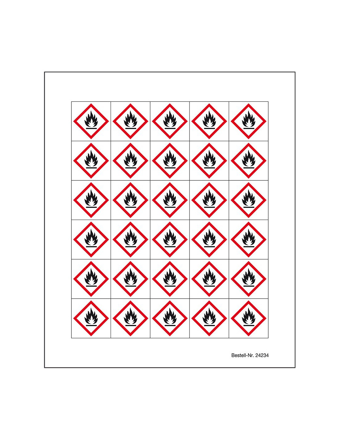 Minisymbool GHS 02 Ontvlambare stoffen, voor markering volgens CLP/GHS, voor gebruiksaanwijzingen, voor binnen- en beperkt buitengebruik, materiaal: zelfklevende folie (sticker), temperatuurbestendig van -40 tot +80°C, resistent tegen veel chemicaliën, maat: 20 x 20 mm, 1 vel = 30 stuks