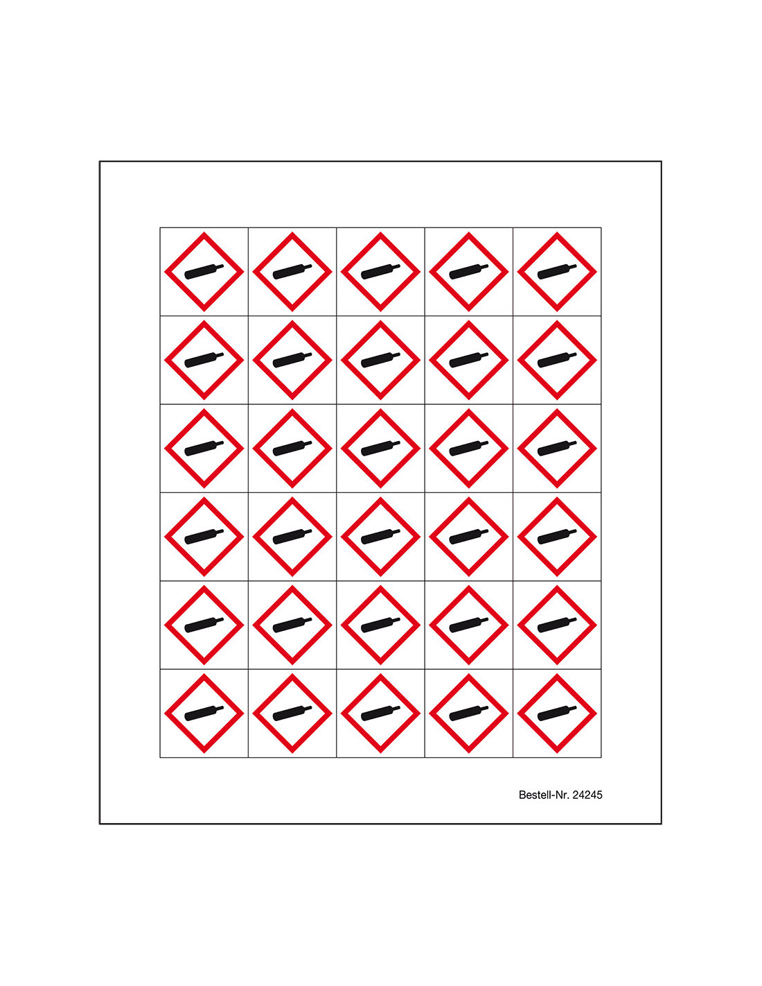 Minisymbool GHS 04 gassen onder druk, voor markering volgens CLP/GHS, voor gebruiksaanwijzingen, voor binnen- en beperkt buitengebruik, materiaal: zelfklevende folie (sticker), temperatuurbestendig van -40 tot +80°C, resistent tegen veel chemicaliën, maat: 20 x 20 mm, 1 vel = 30 stuks