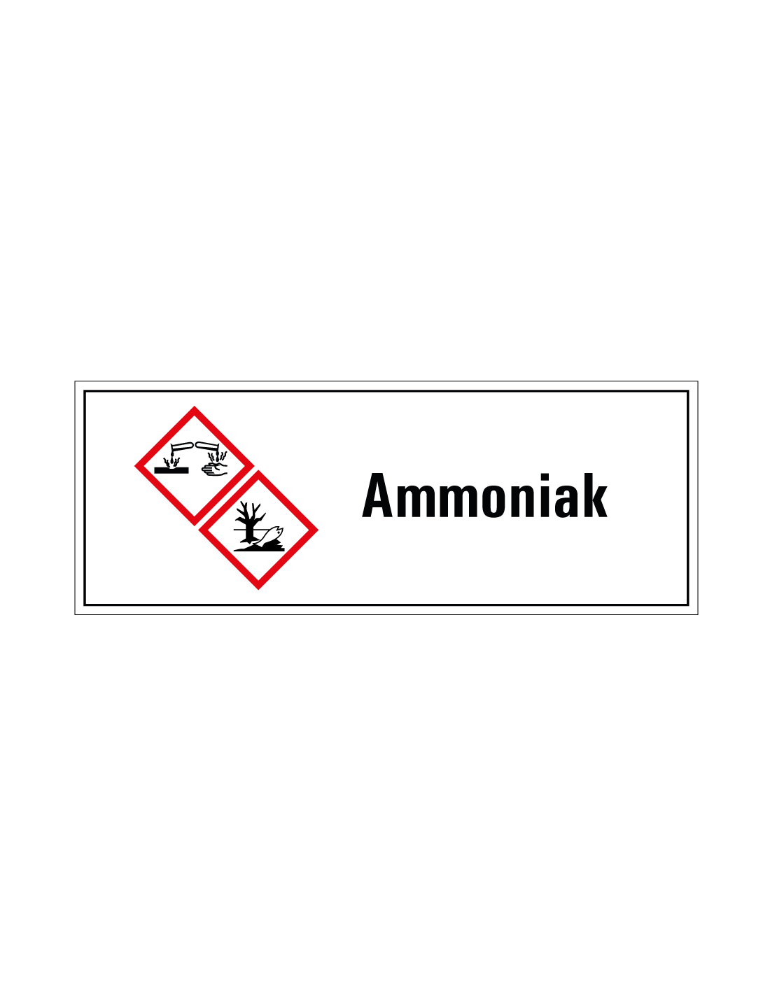 De ammoniak 2 GHS tekststicker met pictogrammen van GHS05 en GHS09 geeft aan dat met een chemische stof voorzichtig omgegaan moet worden. Er zitten namelijk gevaarlijke chemicaliën in de stof die de gezondheid kunnen schaden.