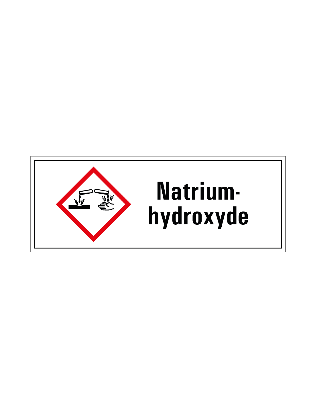 De natriumhydroxyde GHS tekststicker met GHS05 pictogram geeft aan dat met een chemische stof voorzichtig omgegaan moet worden. Er zitten namelijk gevaarlijke chemicaliën in de stof die de gezondheid kunnen schaden.