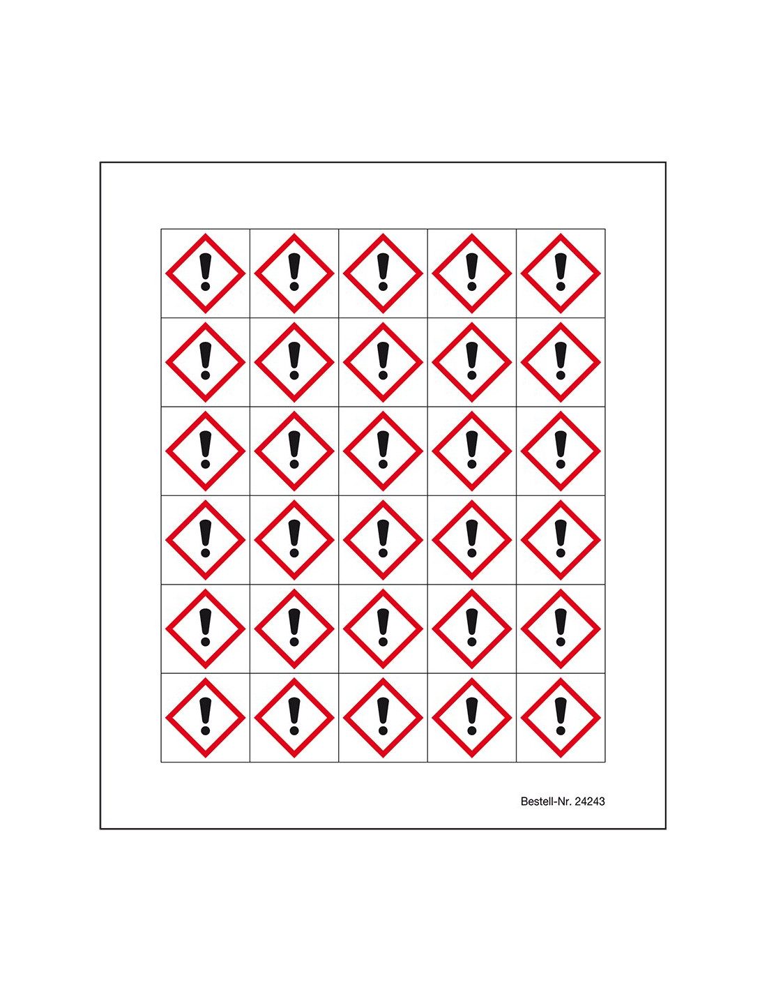 Minisymbool GHS 07 Schadelijk, voor markering volgens CLP/GHS, voor Gebruiksaanwijzingen, voor binnen- en beperkt buitengebruik, materiaal: zelfklevende folie (sticker), temperatuurbestendig van -40 tot +80°C, resistent tegen veel chemicaliën, maat: 20 x 20 mm, 1 vel = 30 stuks