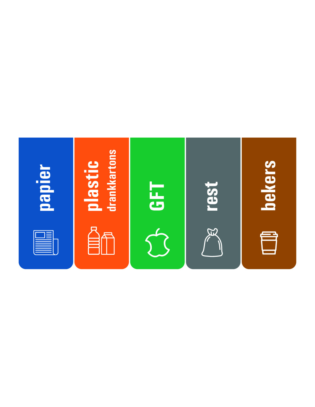 - Afvalstromen: Rest, Papier, Plastic, GFT, Bekers