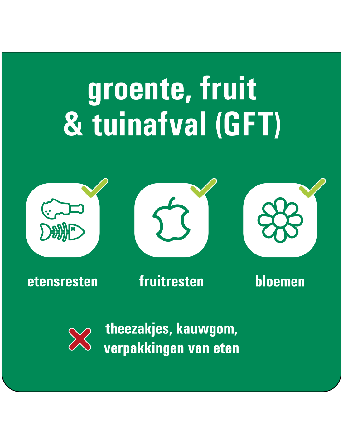 De Groente, fruit & tuinafval sticker laat zien dat je hier GFT of organisch afval kunt deponeren. Daarnaast laat de sticker zien wat je hier niet mag deponeren. Door deze sticker te gebruiken laat je dit op een duidelijke manier zien en voorkom je afval op straat.