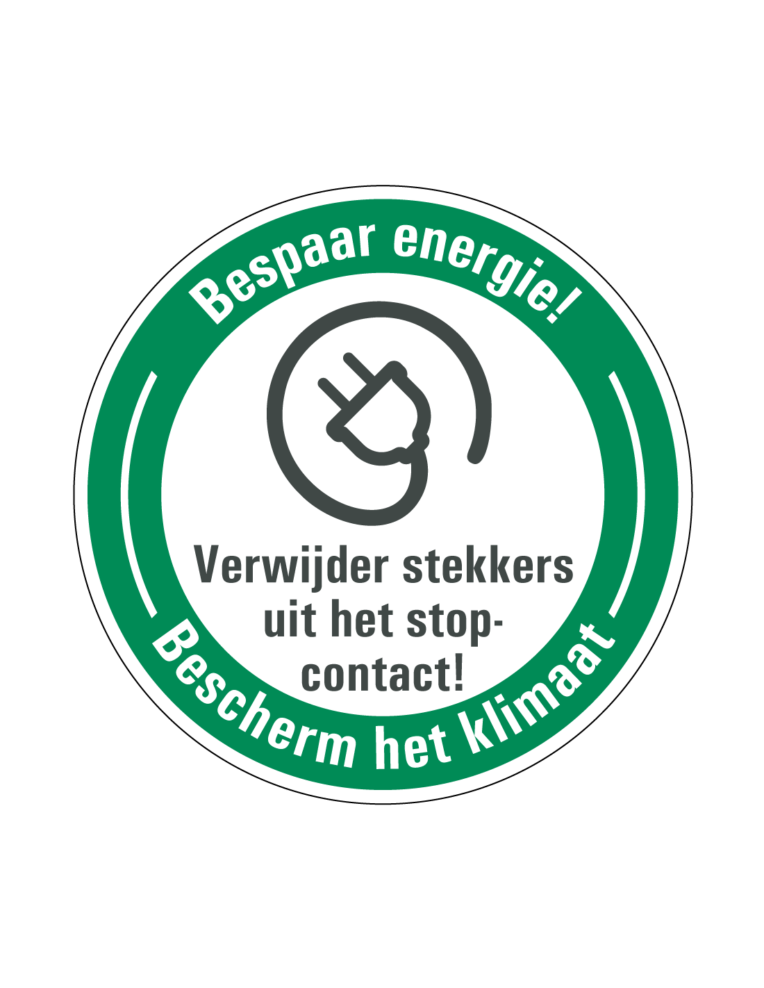 Dit kan bijvoorbeeld door stekkers uit het stopcontact te halen aan het einde van de dag. De energie besparen sticker verwijder stekkers is verkrijgbaar in meerdere afmetingen en hecht het beste op een gladde en vetvrije ondergrond. De verwachte levensduur van de stickers is zeker vijf jaar.