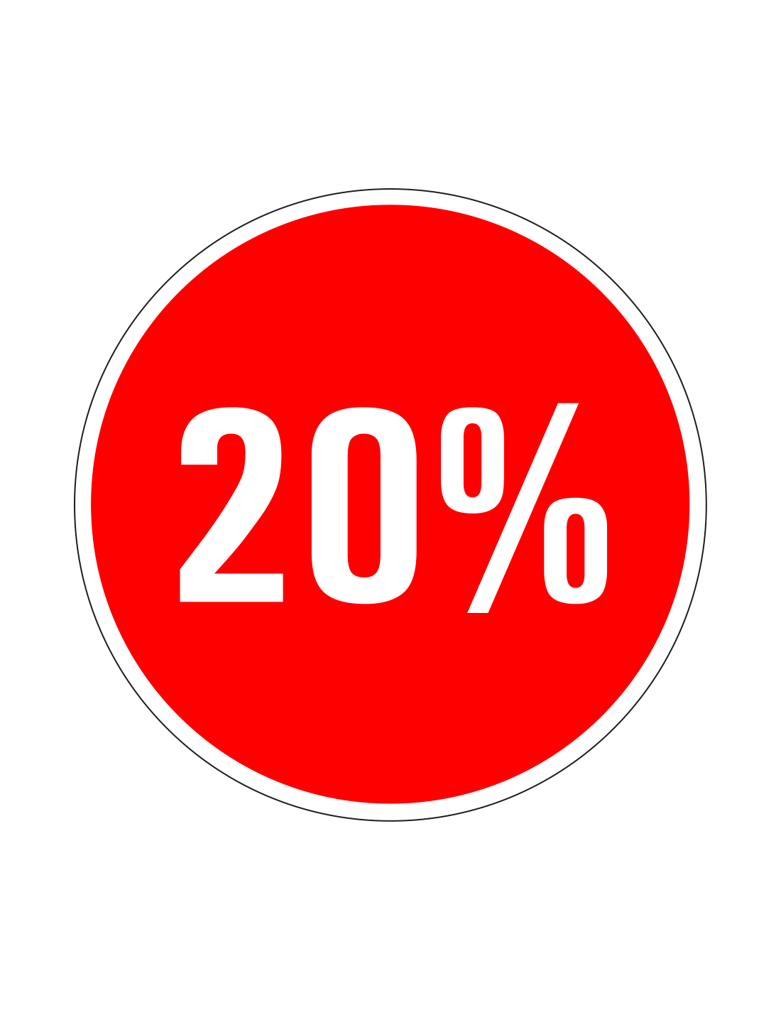 De korting sticker 20% op vel is een ronde sticker met kortingspercentage om aan te geven dat er op dit product een korting van 20% van toepassing is. De sticker is voorzien van een kortingspercentage in witte letters op een rode achtergrond. De sticker is verkrijgbaar in verschillende afmetingen en verschillende aantallen op vel en is geschikt voor binnen- en beperkt buitengebruik.