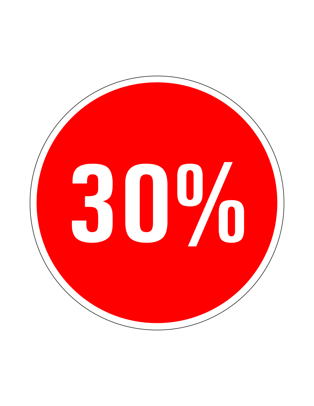 De korting sticker 30% op vel is een ronde sticker met kortingspercentage om aan te geven dat er op dit product een korting van 30% van toepassing is. De sticker is voorzien van een kortingspercentage in witte letters op een rode achtergrond. De sticker is verkrijgbaar in verschillende afmetingen en verschillende aantallen op vel en is geschikt voor binnen- en beperkt buitengebruik.