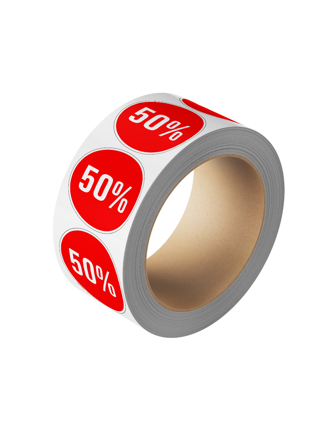 De korting sticker 50% op rol is een ronde sticker met kortingspercentage om aan te geven dat er op dit product een korting van 50% van toepassing is. De stickers zijn voorzien van een kortingspercentage in witte letters op een rode achtergrond. De stickers zijn verkrijgbaar in verschillende afmetingen en verschillende aantallen op rol.