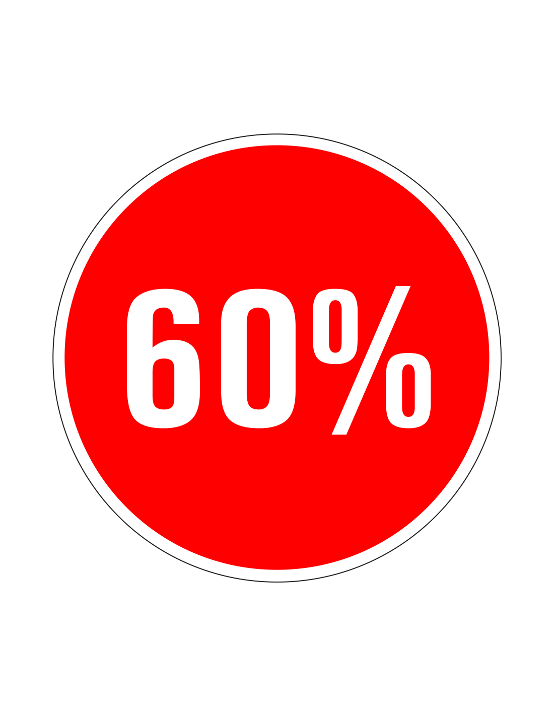 De korting sticker 60% op vel is een ronde sticker met kortingspercentage om aan te geven dat er op dit product een korting van 60% van toepassing is. De sticker is voorzien van een kortingspercentage in witte letters op een rode achtergrond. De sticker is verkrijgbaar in verschillende afmetingen en verschillende aantallen op vel en is geschikt voor binnen- en beperkt buitengebruik.
