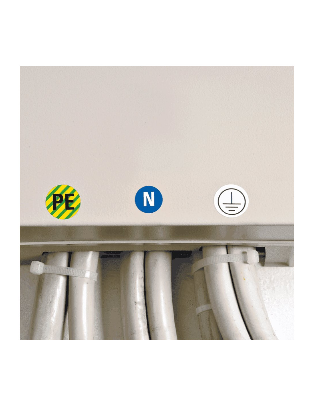 De beschermende aarding sticker op rol is een wit met zwarte geleider markering met aarde symbool. Om dit aarde symbool zit een zwart rondje. Dit houdt in dat de aarde beschermd is. Deze geleider markering is verkrijgbaar in drie verschillende afmetingen. De rollen zijn in de aantallen 500 en 1000 stuks beschikbaar.
