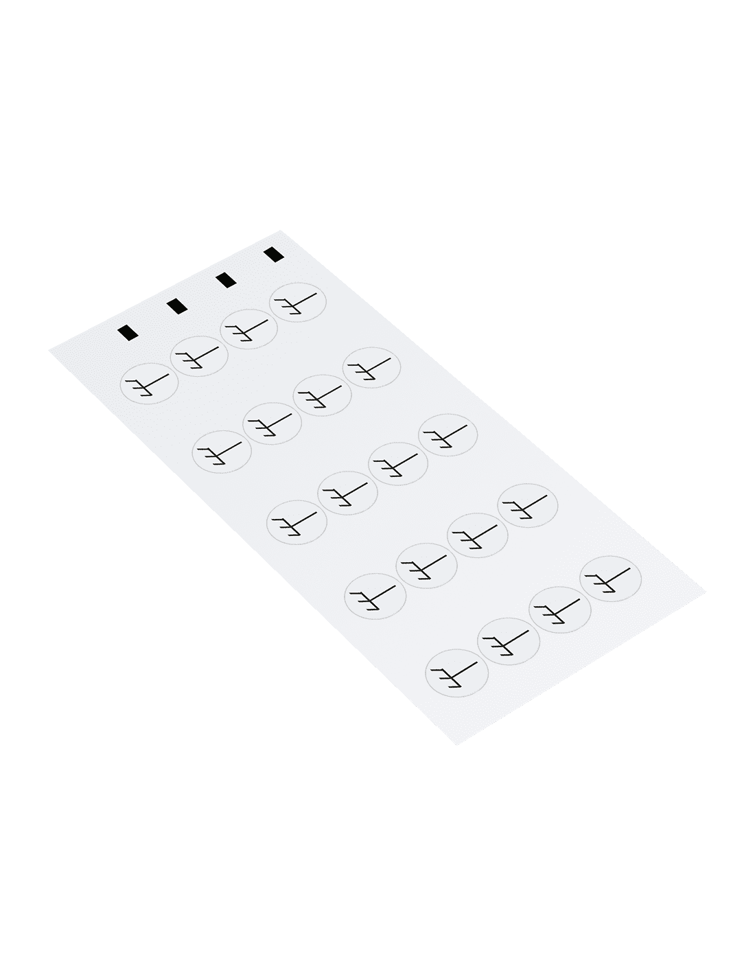 De massa geleider sticker is een wit met zwarte geleider markering met een symbool voor massa erop gedrukt. Deze geleider markering is verkrijgbaar in vijf verschillende afmetingen. Afhankelijk van de grootte zijn de massa geleider stickers verkrijgbaar op vellen van 10 en 20 stuks.