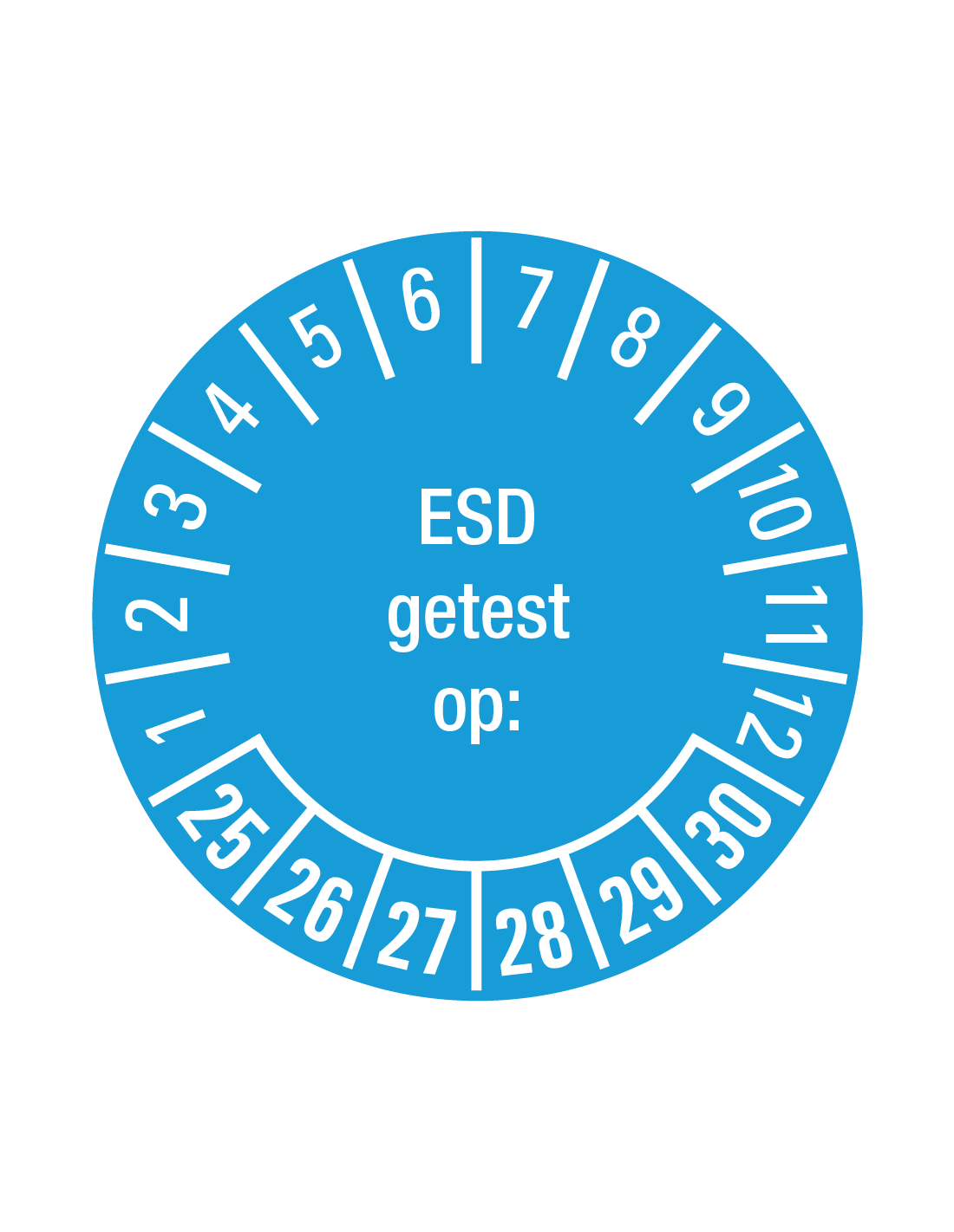 De ESD getest op keuringssticker 25-30 op rol gebruik je om aan te geven dat er getest is op Electro Static Discharge op een bepaalde datum. De ESD getest op keuringssticker is voorzien van jaartallen en maanden. Hierdoor is de keuringssticker eenvoudig af te lezen. Bovendien is de sticker bestand tegen licht chemicaliën en is deze temperatuurbestendig van -40 tot +80°C.