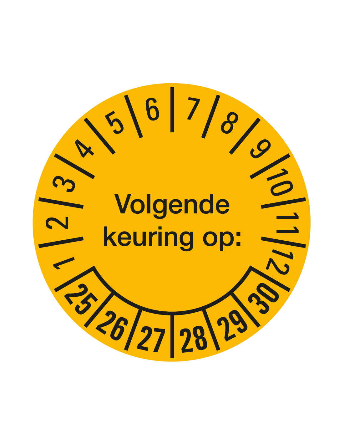 De Volgende keuring op sticker 25-30 op rol is ontworpen voor periodieke keuringen van 2025 tot en met 2030. Gemaakt van zelfklevende folie, zonder laminaat laag, biedt deze sticker een betrouwbare herinnering voor inspecties. Dankzij zijn bestendigheid tegen lichte chemicaliën en oliën, garandeert deze sticker een verwachte levensduur van circa 5 jaar. Met de opvallende geel-zwarte kleuren en de Nederlandse tekst "Volgende keuring op" is deze sticker geschikt voor een goede controle.