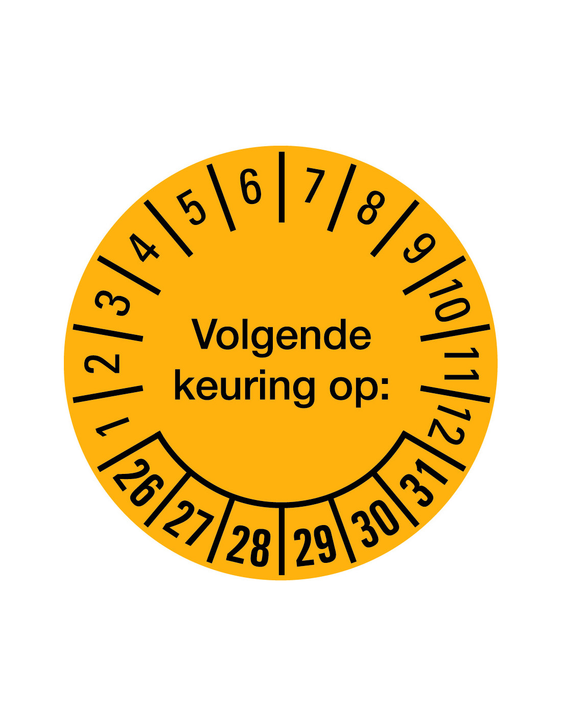 De Volgende keuring op sticker 26-31 op vel is ontworpen voor periodieke keuringen van 2026 tot en met 2031. Gemaakt van zelfklevende folie, zonder laminaat laag, biedt deze sticker een betrouwbare herinnering voor inspecties. Dankzij zijn bestendigheid tegen lichte chemicaliën en oliën, garandeert deze sticker een verwachte levensduur van circa 5 jaar. Met de opvallende geel-zwarte kleuren en de Nederlandse tekst "Volgende keuring op" is deze sticker geschikt voor een goede controle.