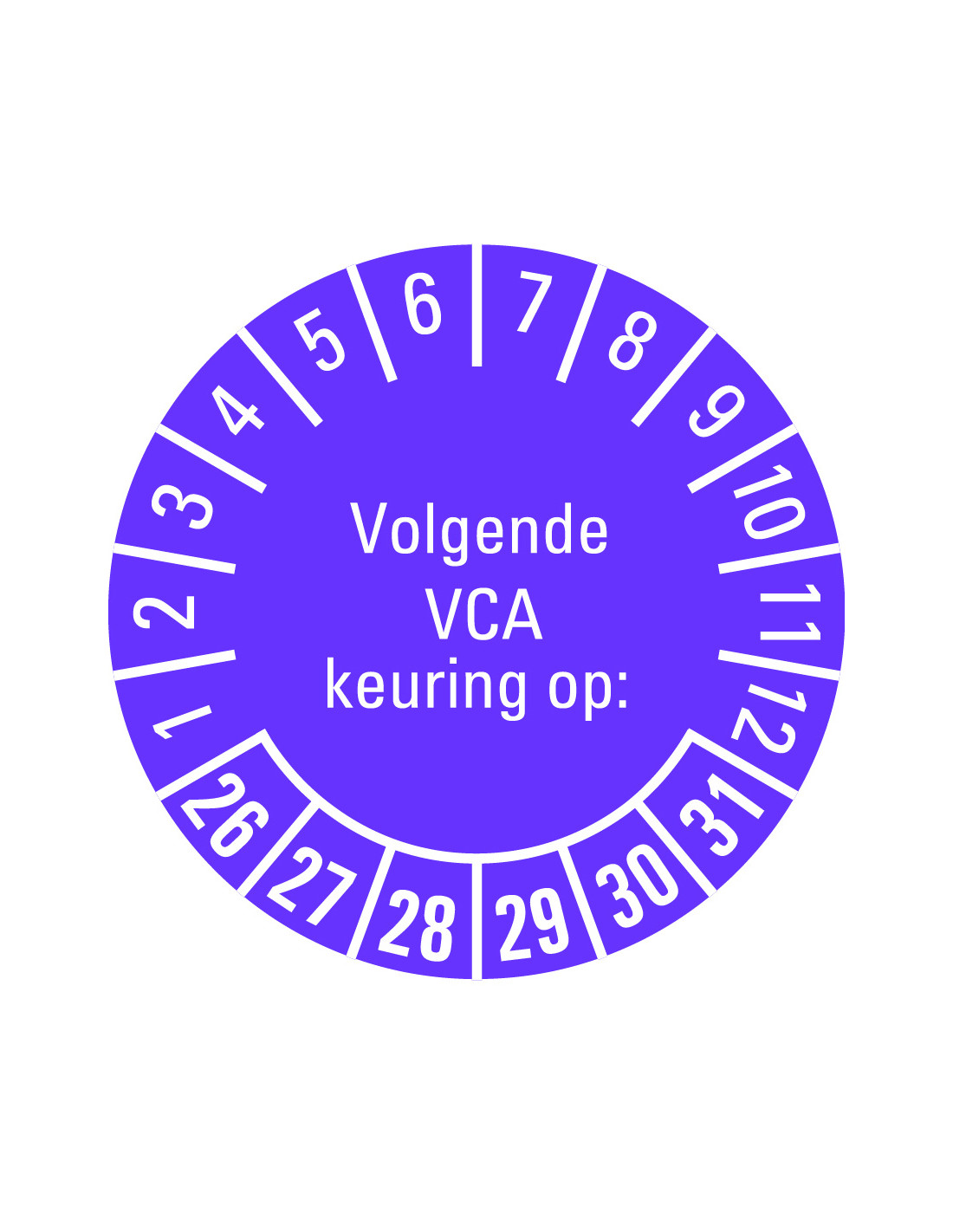 De keuringssticker volgende VCA keuring op sticker 26-31 is te gebruiken voor alle VCA keuringen. VCA staat voor Veiligheid. Gezondheid en Milieu Checklist Aannemers. Deze kunnen ze gebruiken om iedere dag een gezond en veilig werken te creëren. De keuringssticker hecht het beste op een gladde en vetvrije ondergrond. Verder is de volgende keuring op sticker verkrijgbaar in drie verschillende afmetingen met elk een apart aantal stickers per vel.