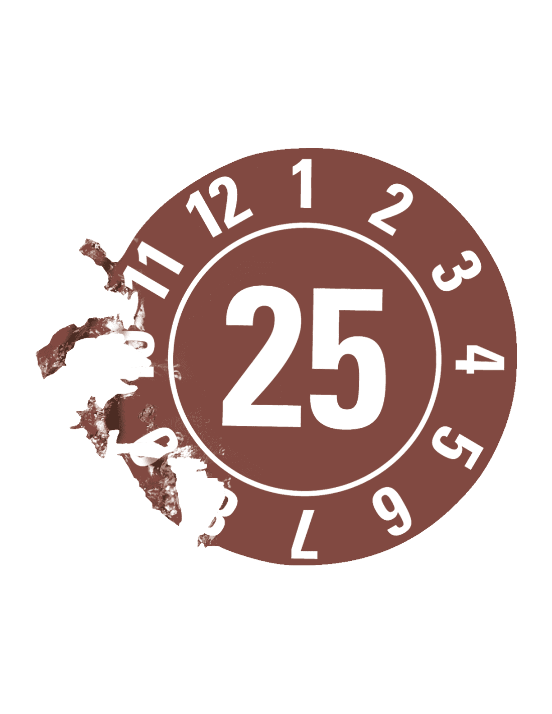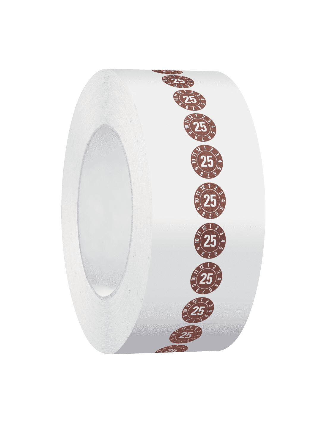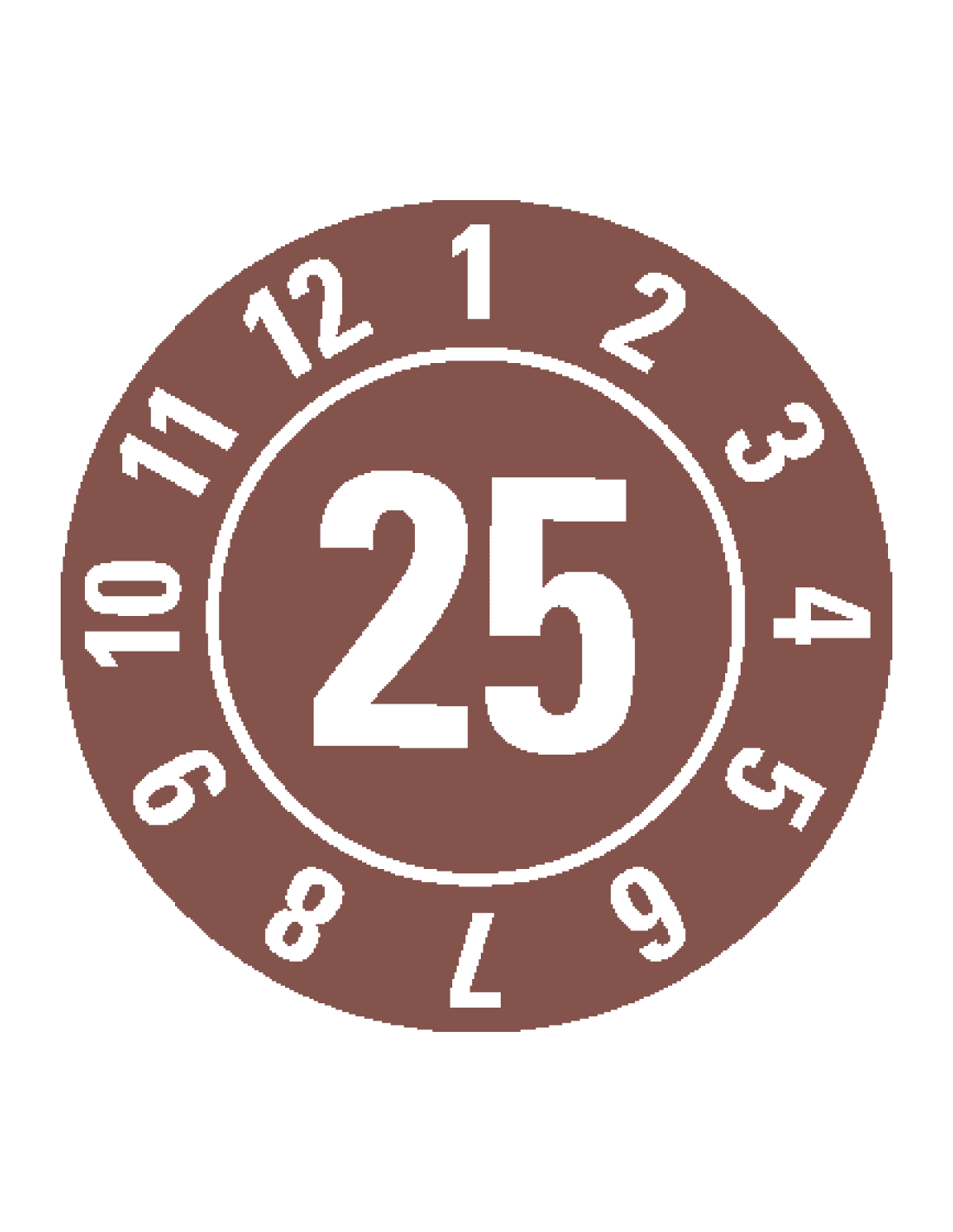 Met deze bruine jaarkeuringssticker 25 kunt u eenvoudig aangeven wanneer de volgende keuring van bepaald apparaat is. U kunt deze keuringssticker gebruiken door een gaatje te knippen in de gewenste maand en plak de keuringssticker vervolgens op het apparaat. De jaartal keuringsstickers van zeer hoge kwaliteit zijn tevens fraudebestendig. Zo voorkomt u dat er keuringen gemanipuleerd kunnen worden. De sticker is immers alleen maar te verwijderen door hem te vernietigen. Verder is de 2025 jaarkeuringssticker gemaakt van zelfklevende documentenfolie en is voorzien van een laminaat beschermlaag.