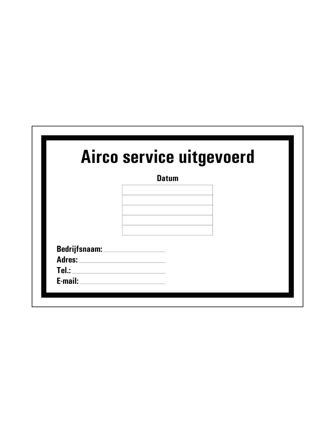 De Airco service sticker is een rechthoekige sticker die aangeeft dat airco service is uitgevoerd en daarnaast kun je de sticker beschrijven met eigen tekst. De sticker is voorzien van de Nederlandse tekst "Airco service uitgevoerd" in zwarte letters op een witte achtergrond. De sticker is verkrijgbaar in verschillende afmetingen en is geschikt voor binnen- en beperkt buitengebruik.