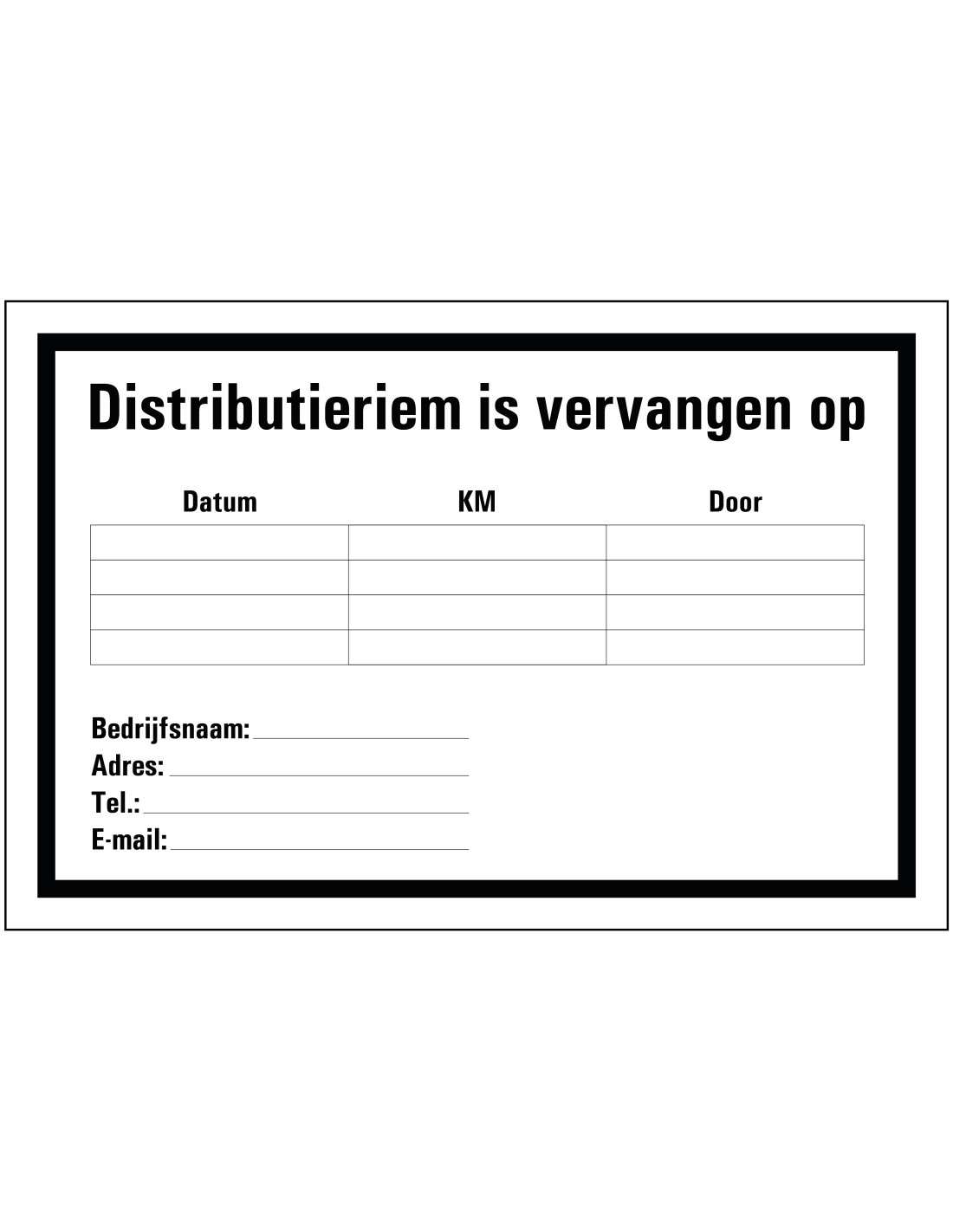 De distributieriem vervangen sticker is een rechthoekige sticker die aangeeft dat distributieriem is vervangen, daarnaast kun je de sticker beschrijven met eigen tekst. De sticker is voorzien van de Nederlandse tekst "Distributieriem is vervangen op" in zwarte letters op een witte achtergrond. De sticker is verkrijgbaar in verschillende afmetingen en is geschikt voor binnen- en beperkt buitengebruik.