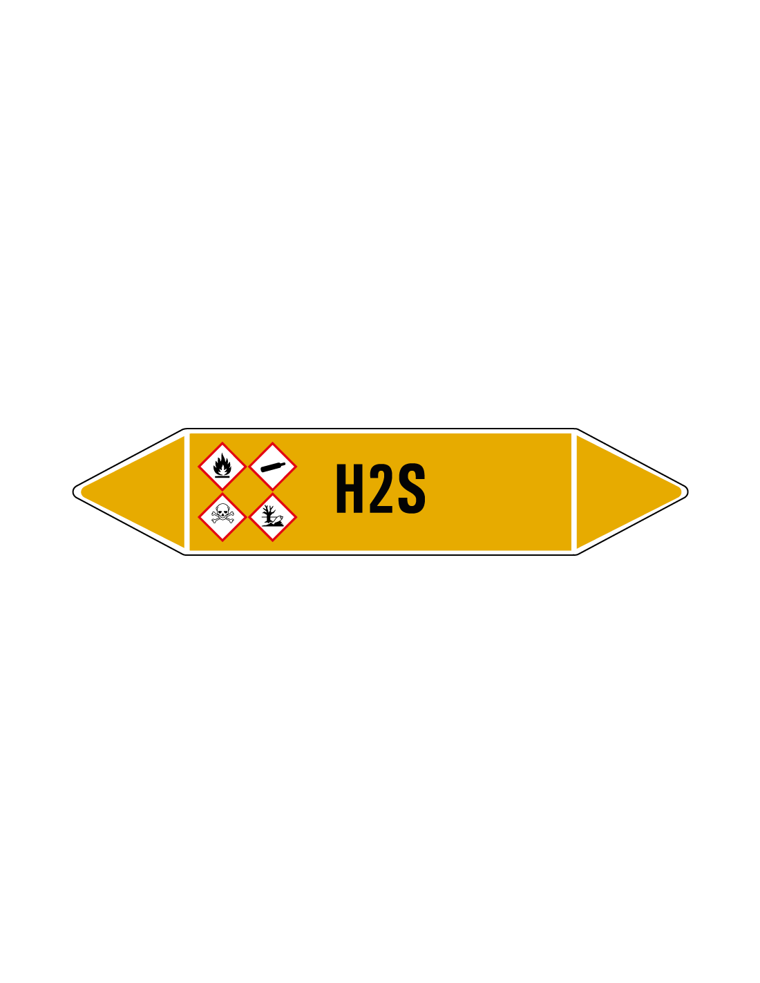 De H2Sleidingmarkering op vel wordt gebruikt om aan te geven dat er zich in een bepaalde leiding gas bevindt. In dit geval gaat het om de specifieke aanduiding van H2S. Aan beide kanten van de leidingmarkering zit een stroomrichting uiteinde. Afhankelijk van hoe de de leiding stroomt kan één zijde verwijderd worden.
