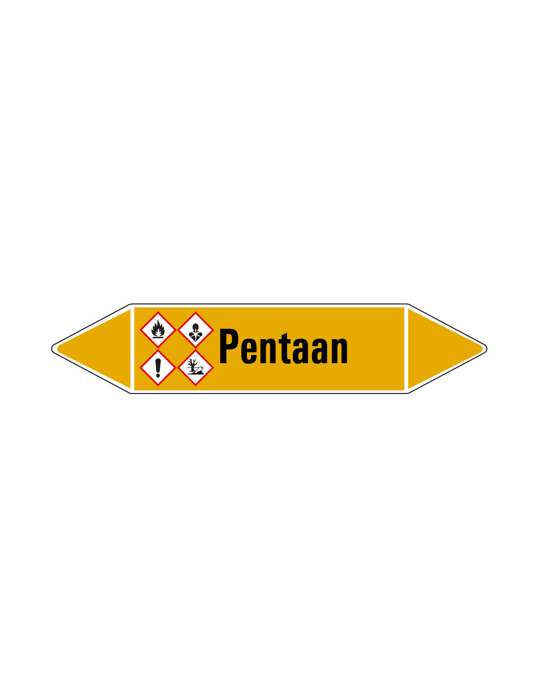 De pentaan leidingmarkering op vel wordt gebruikt om aan te geven dat er zich in een bepaalde leiding gas bevindt. In dit geval gaat het om de specifieke aanduiding van pentaan. Aan beide kanten van de leidingmarkering zit een stroomrichting uiteinde. Afhankelijk van hoe de de leiding stroomt kan één zijde verwijderd worden.
