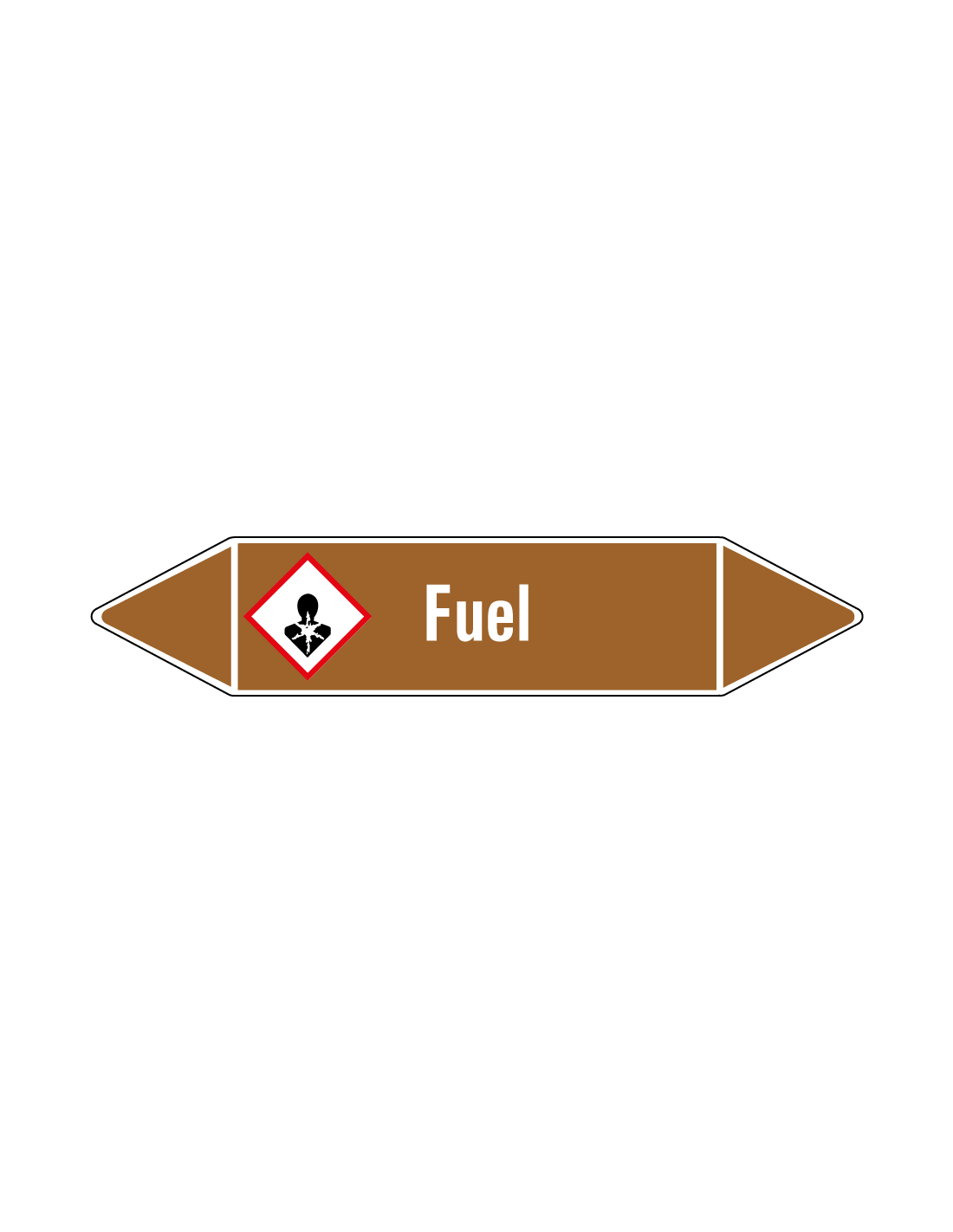 De fuel leidingmarkering op vel wordt gebruikt om aan te geven dat er zich in een bepaalde leiding een ontvlambare vloeistof bevindt. In dit geval gaat het om de specifieke aanduiding van fuel. Aan beide kanten van de leidingmarkering zit een stroomrichting uiteinde. Afhankelijk van hoe de de leiding stroomt kan één zijde verwijderd worden.