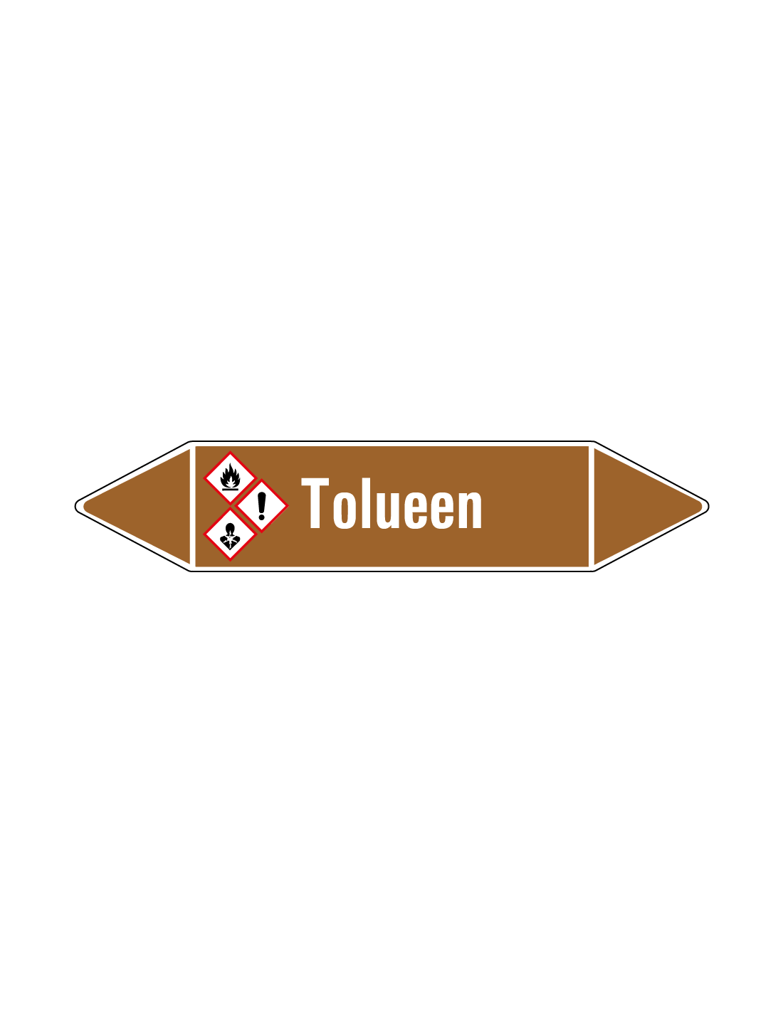 De tolueen leidingmarkering op vel wordt gebruikt om aan te geven dat er zich in een bepaalde leiding een ontvlambare vloeistof bevindt. In dit geval gaat het om de specifieke aanduiding van tolueen. Aan beide kanten van de leidingmarkering zit een stroomrichting uiteinde. Afhankelijk van hoe de de leiding stroomt kan één zijde verwijderd worden.