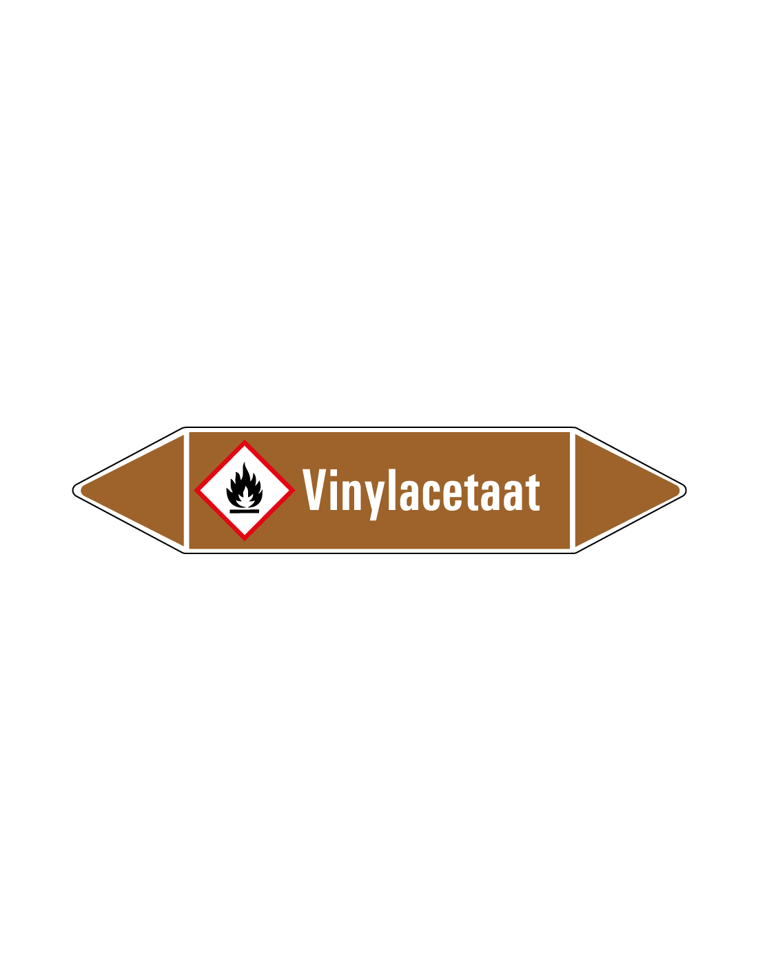 De vinylacetaat leidingmarkering op vel wordt gebruikt om aan te geven dat er zich in een bepaalde leiding een ontvlambare vloeistof bevindt. In dit geval gaat het om de specifieke aanduiding van vinylacetaat. Aan beide kanten van de leidingmarkering zit een stroomrichting uiteinde. Afhankelijk van hoe de de leiding stroomt kan één zijde verwijderd worden.