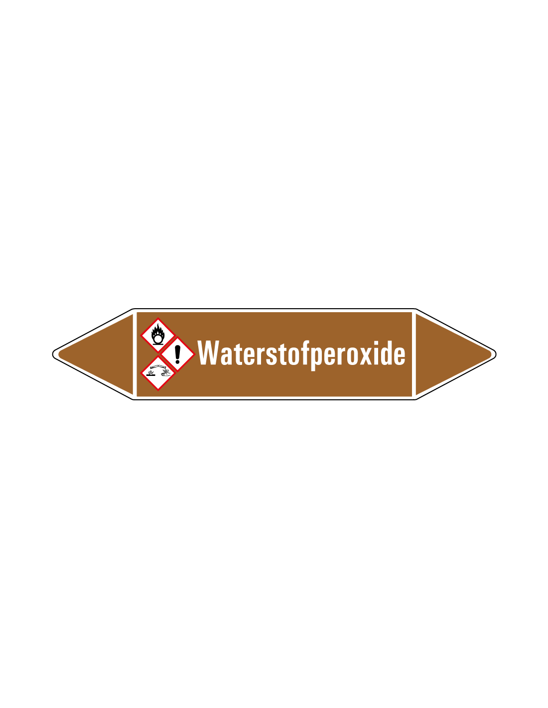 De waterstofperoxide leidingmarkering op vel wordt gebruikt om aan te geven dat er zich in een bepaalde leiding een ontvlambare vloeistof bevindt. In dit geval gaat het om de specifieke aanduiding van waterstofperoxide. Aan beide kanten van de leidingmarkering zit een stroomrichting uiteinde. Afhankelijk van hoe de de leiding stroomt kan één zijde verwijderd worden.