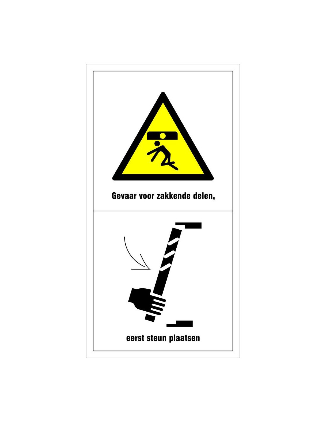 Deze machinemarkering sticker wijst uw werknemers erop ze op moeten passen voor zakkende onderdelen, er moet eerst een steun geplaats worden voor betreding. Ondanks dat werknemers vaak goed overweg kunnen met machines, zit een ongeluk toch in een klein hoekje. Daarom kunnen machine stickers niet ontbreken. Machine etiketten dragen boodschappen over aan werknemers. Dit kunnen specifieke waarschuwingen zijn, hierdoor kunnen werknemers beter op een situatie anticiperen en hierop weer vervolgens reageren. Door het toepassen van deze sticker op uw machines wordt de veiligheid van uw werknemers gewaarborgd.