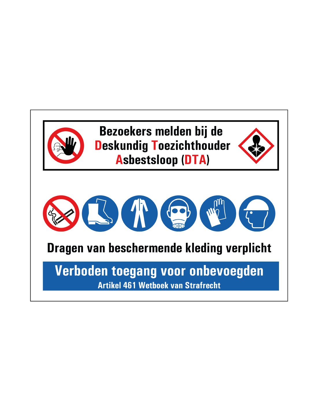 De bezoekers melden bij DTA asbestloop bouwplaats sticker kun je gebruiken om aan te geven dat bezoekers voordat ze de bouwplaats op gaan diverse beschermende kleding aan moeten doen. Hiervoor moeten ze zich melden bij de Deskundig Toezichthouder Asbestloop, ook wel afgekort met DTA.