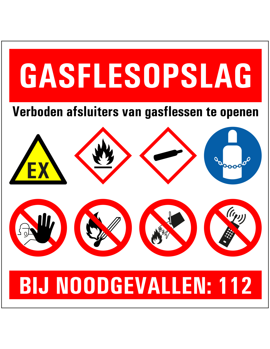 De gasflesopslag verboden te openen sticker kun je gebruiken om aan te geven dat gasflessen op een bepaalde locatie worden opgeslagen. Op de sticker staan meerdere zaken die verboden zijn om te doen in deze ruimte vanwege de veiligheid. Ook staat het alarmnummer erbij vermeld mocht er een calamiteit plaatsvinden.